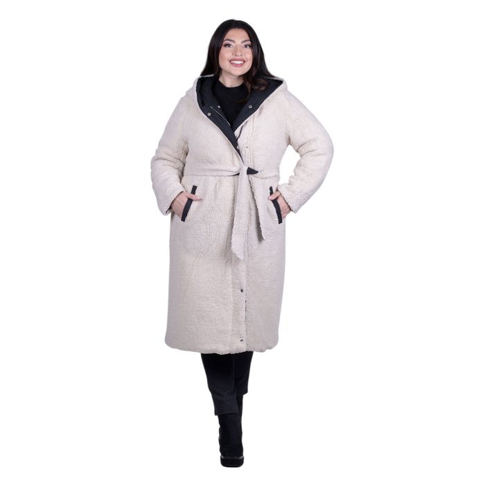 Platinum Μπουφάν Λευκό Γυναικείο Πρόβατο Double Face Με Κουκούλα & Ζώνη Casual Midi All Day – 8568-W