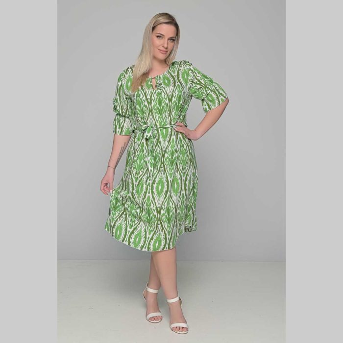 Gomore Φόρεμα Πράσινο Με Εμπριμέ Γυναικείο Midi Εβαζέ Με Ζώνη Τρουακαρ All Day – 52671-GR