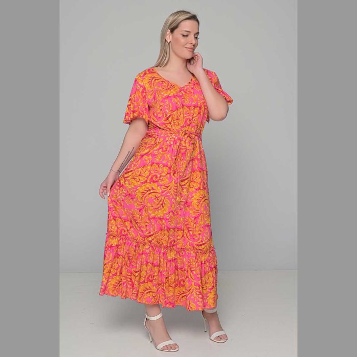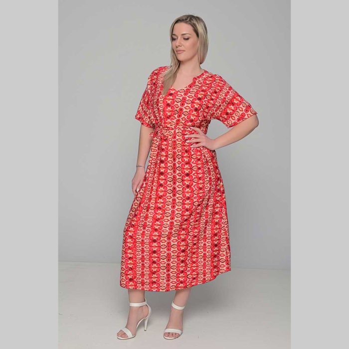 Gomore Φόρεμα Κοραλοκόκκινο Με Εμπριμέ Γυναικείο Μακρύ Εβαζέ Με Ζώνη Κοντομάνικο All Day – 52675