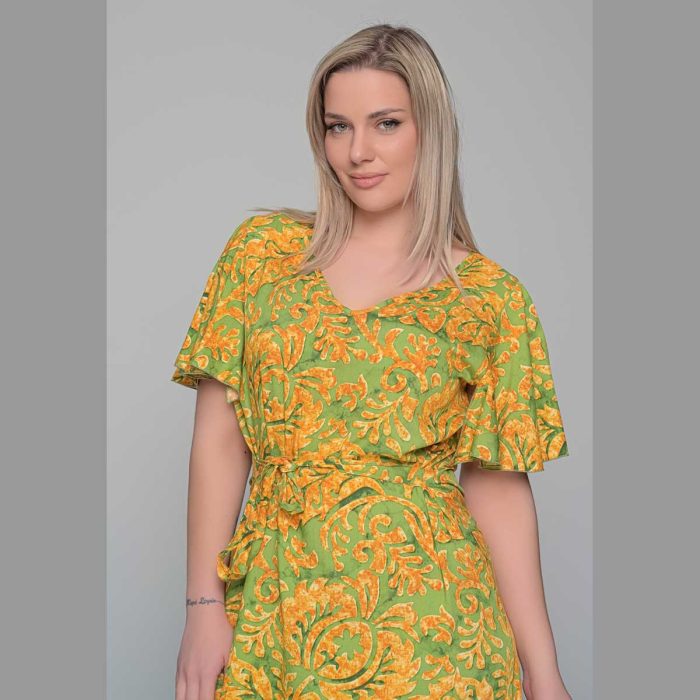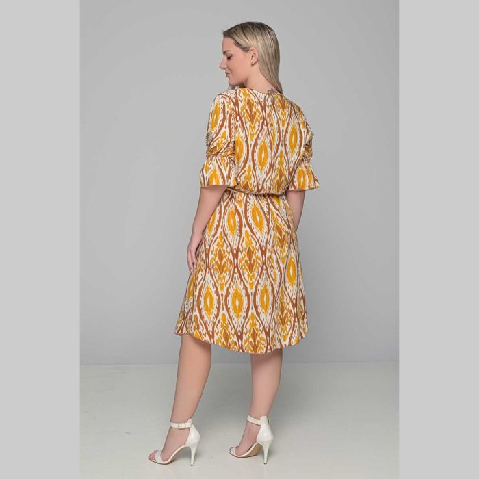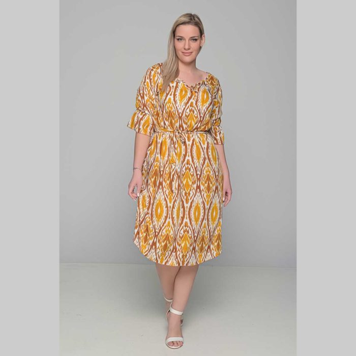 Gomore Φόρεμα Ώχρα Με Εμπριμέ Γυναικείο Midi Εβαζέ Με Ζώνη Τρουακαρ All Day – GM-52671-C