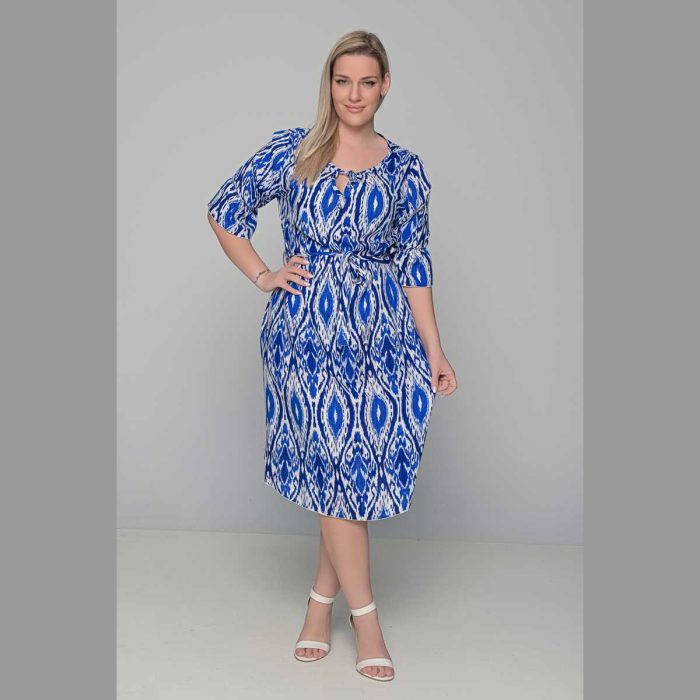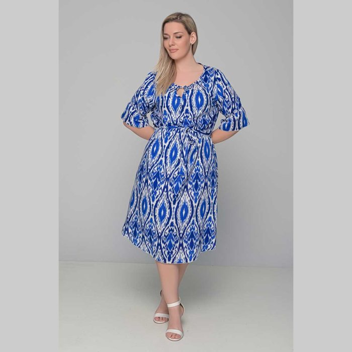 Gomore Φόρεμα Γαλάζιο Με Εκρού Σχέδια Γυναικείο Midi Εβαζέ Τρουακαρ Καθημερινό – GM-52682-BL