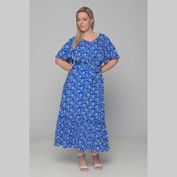 Gomore Φόρεμα Μπλε Ρουά Με Λευκά Floral Γυναικείο Μακρύ Εβαζέ Κοντομάνικο All Day – 52679-LB