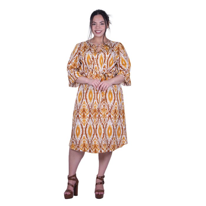 Gomore Φόρεμα Ώχρα Με Εμπριμέ Γυναικείο Midi Εβαζέ Με Ζώνη Τρουακαρ All Day – G-52671-CH
