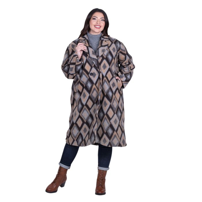 Platinum Παλτό Καφέ Με Καμηλό Γυναικείο Με Σχέδιο Ρόμβους All Day Free Size – IT-52637-BR