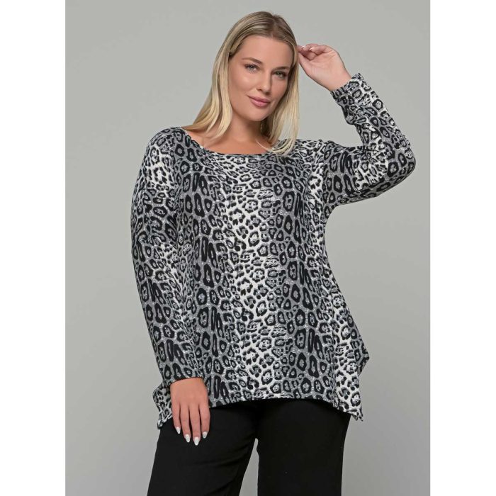 Gomore Μπλούζα Ασπρόμαυρη Γυναικεία Με Γκρι Animal Print Μακριά Εβαζέ All Day XXL – 36102