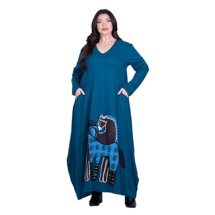 Platinum Φόρεμα Πετρόλ Γυναικείο Απλικέ Maxi ”Ερωτευμένα Άλογα Patchwork” All Day – PL-233-KD