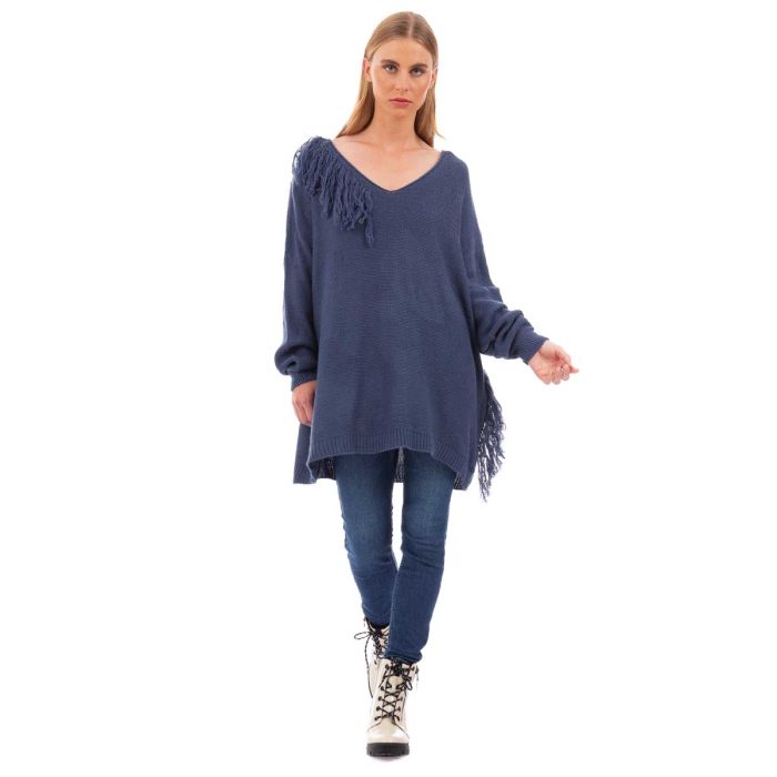 Original price was: €38.90.€24.90Η τρέχουσα τιμή είναι: €24.90.Platinum Μπλούζα Μπλε – Ραφ Γυναικεία Πλεκτή Μακριά Φαρδιά Με Ντεκολτέ & Κρόσσια Casual Free Size – 24143-BL