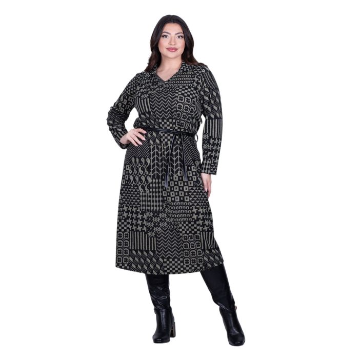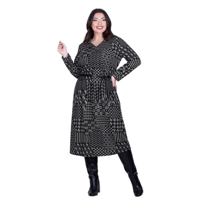 Gomore Φόρεμα Χακί – Μαύρο Γυναικείο Με Σχέδια Γιακά Μidi Ίσια Γραμμή & Ζώνη – GM-56766-GR