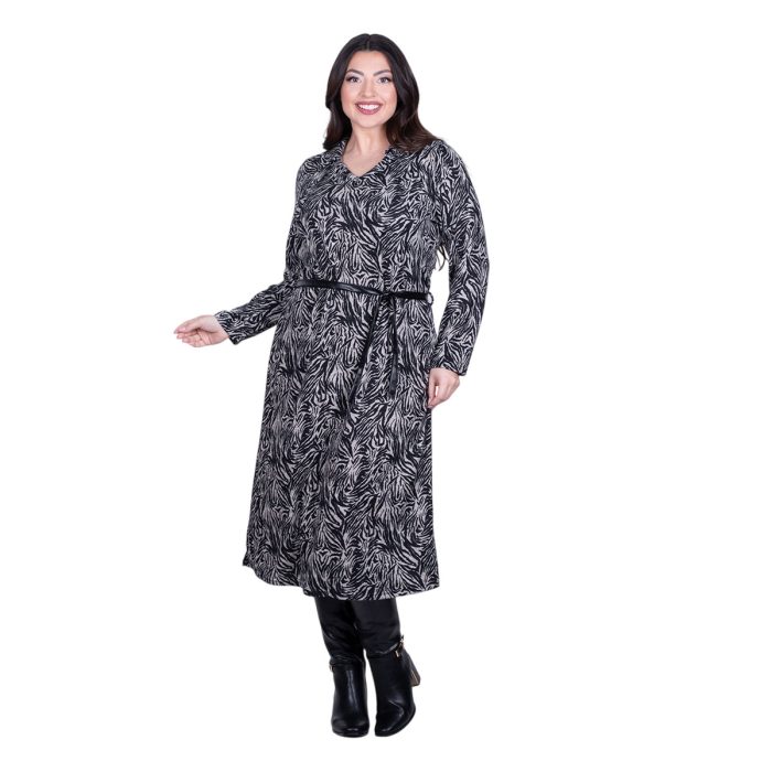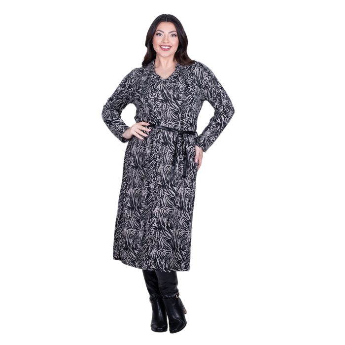 Gomore Φόρεμα Ασπρόμαυρο Γυναικείο Με Σχέδια Ζέμπρα Γιακά Μidi Ίσια Γραμμή & Ζώνη – BC-56766
