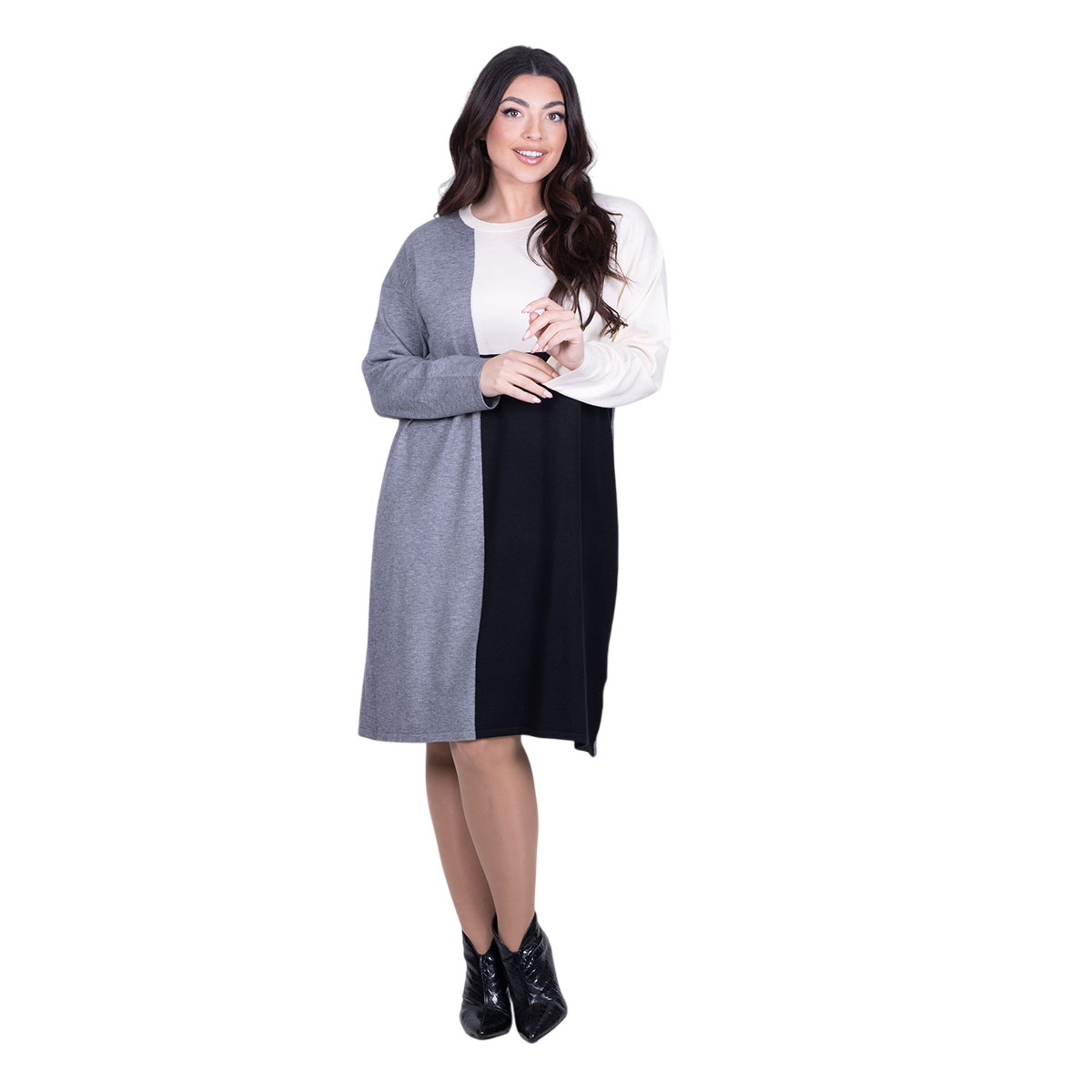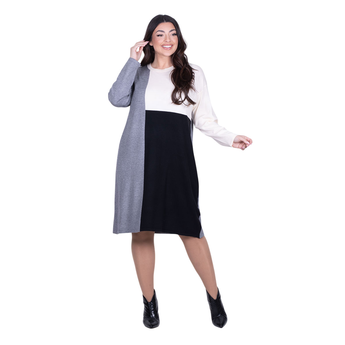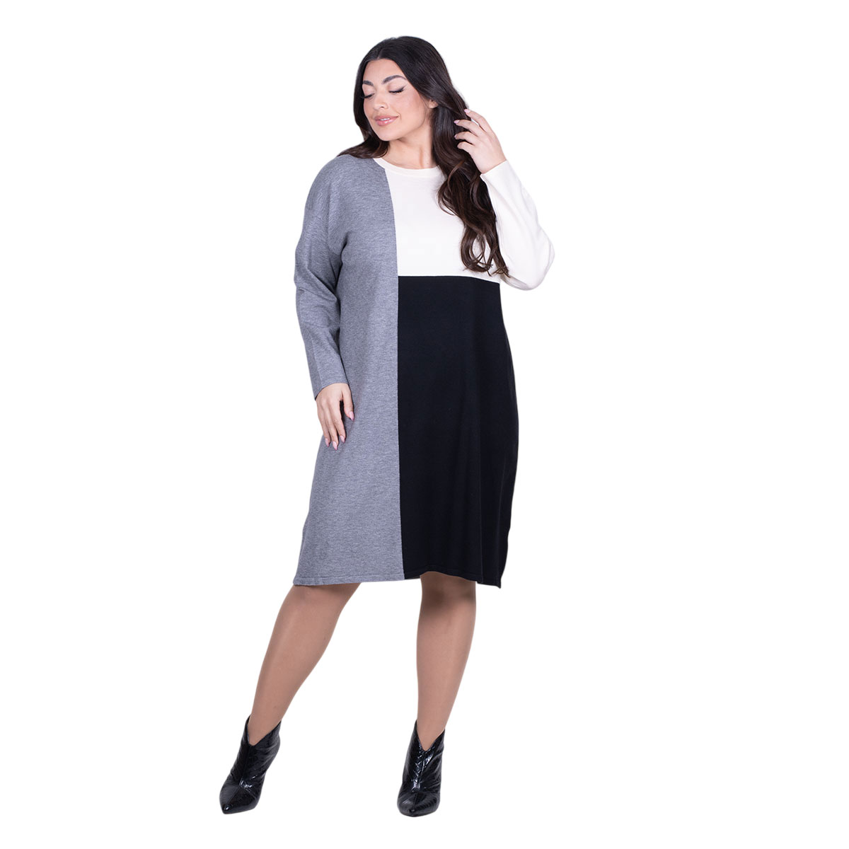 Platinum, στιλάτο, φόρεμα σε τριχρωμία χρωμάτων του γκρι, μαύρου και εκρού, γυναικείο, από λεπτό πλεκτό, midi, ελαστικό, σε ίσια γραμμή, κομψό, στρογγυλή λαιμόκοψη και μακριά μανίκια. Ιδιαίτερα φιλικό με το δέρμα σας!