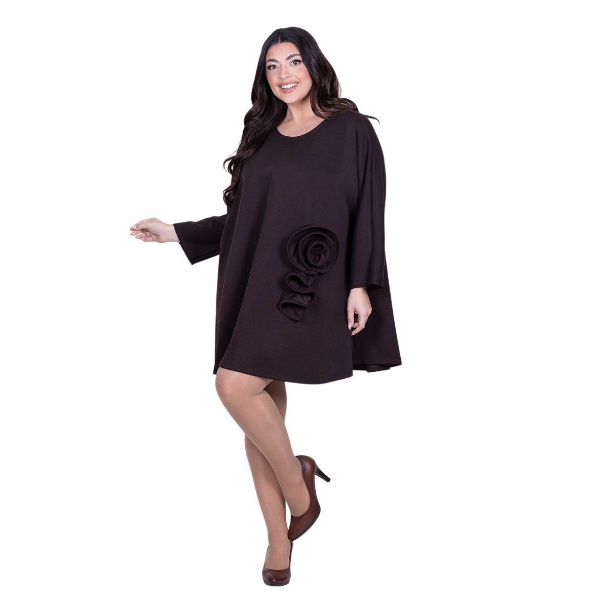 Fairyland Moschato, χαρούμενο, φόρεμα καφέ, γυναικείο, κοντό, στρογγυλή λαιμόκοψη, μακριά μανίκια χωρίς μανικοκόλληση και εξωτερικό σχέδιο ”λουλούδι” σαν μπουτονιέρα στην αριστερή του πλευρά. Είναι ριχτό, σε γραμμή άλφα και εβαζάρι πλούσια στο τελείωμα.