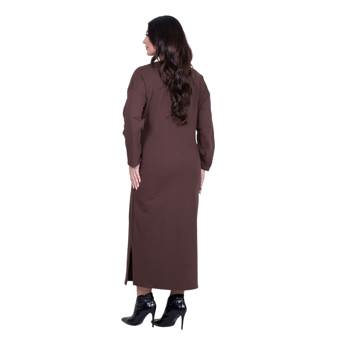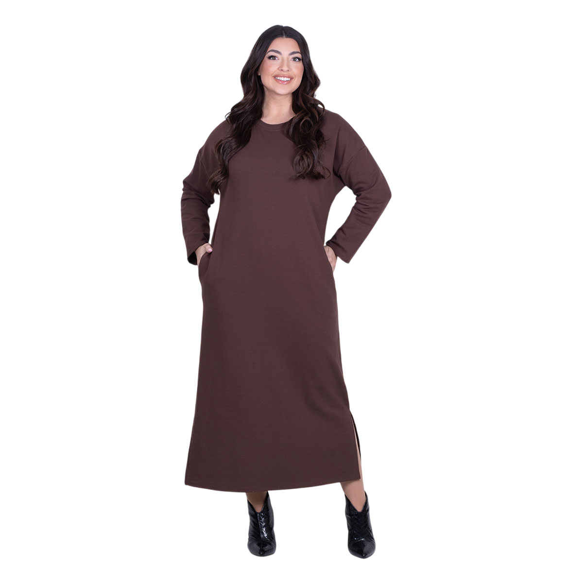 Fairyland Moschato, καθημερινό, φόρεμα καφέ, γυναικείο, σε γραμμή άλφα, μακρύ, μακριά μανίκια με χαμηλή μανικοκόλληση, casual, με στρογγυλή λαιμόκοψη. Στα πλαϊνά του έχει εσωτερικές τσέπες και στο τελείωμα, ανοίγματα 25 εκατοστά. Φοριέται όλη τη διάρκεια της ημέρας.
