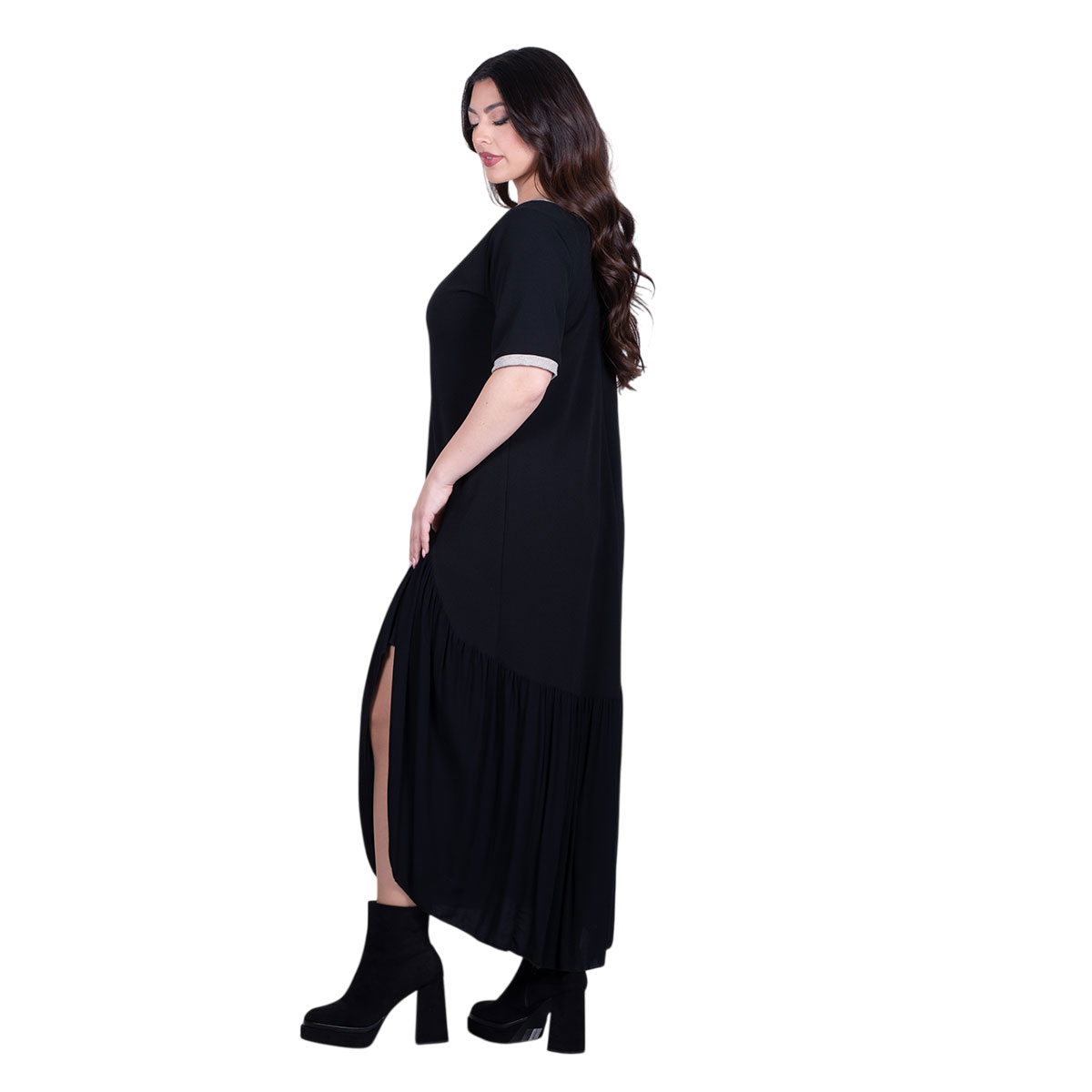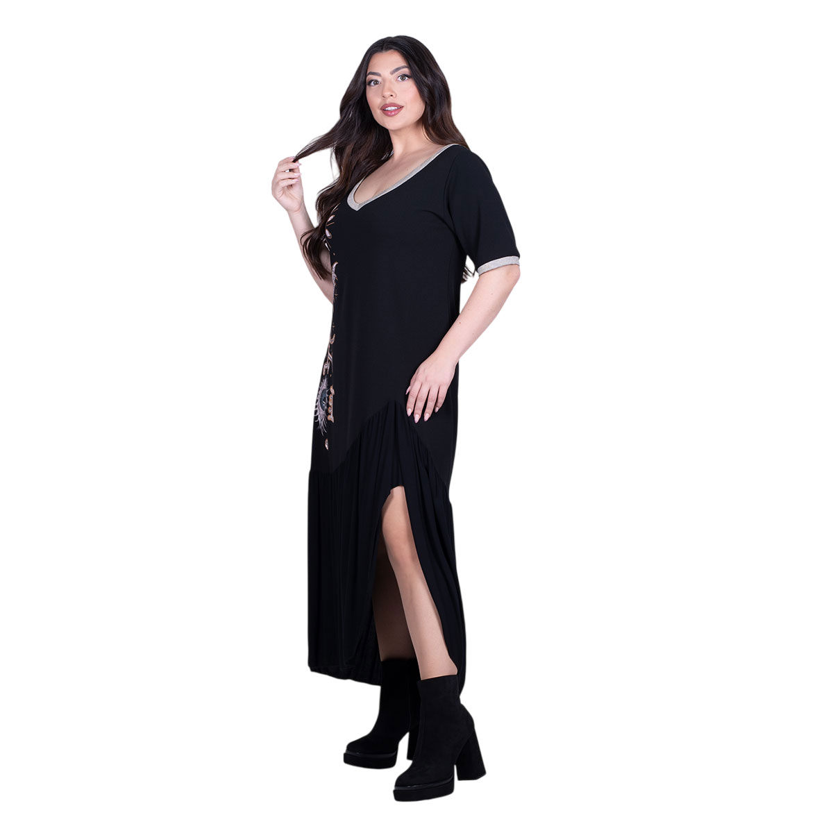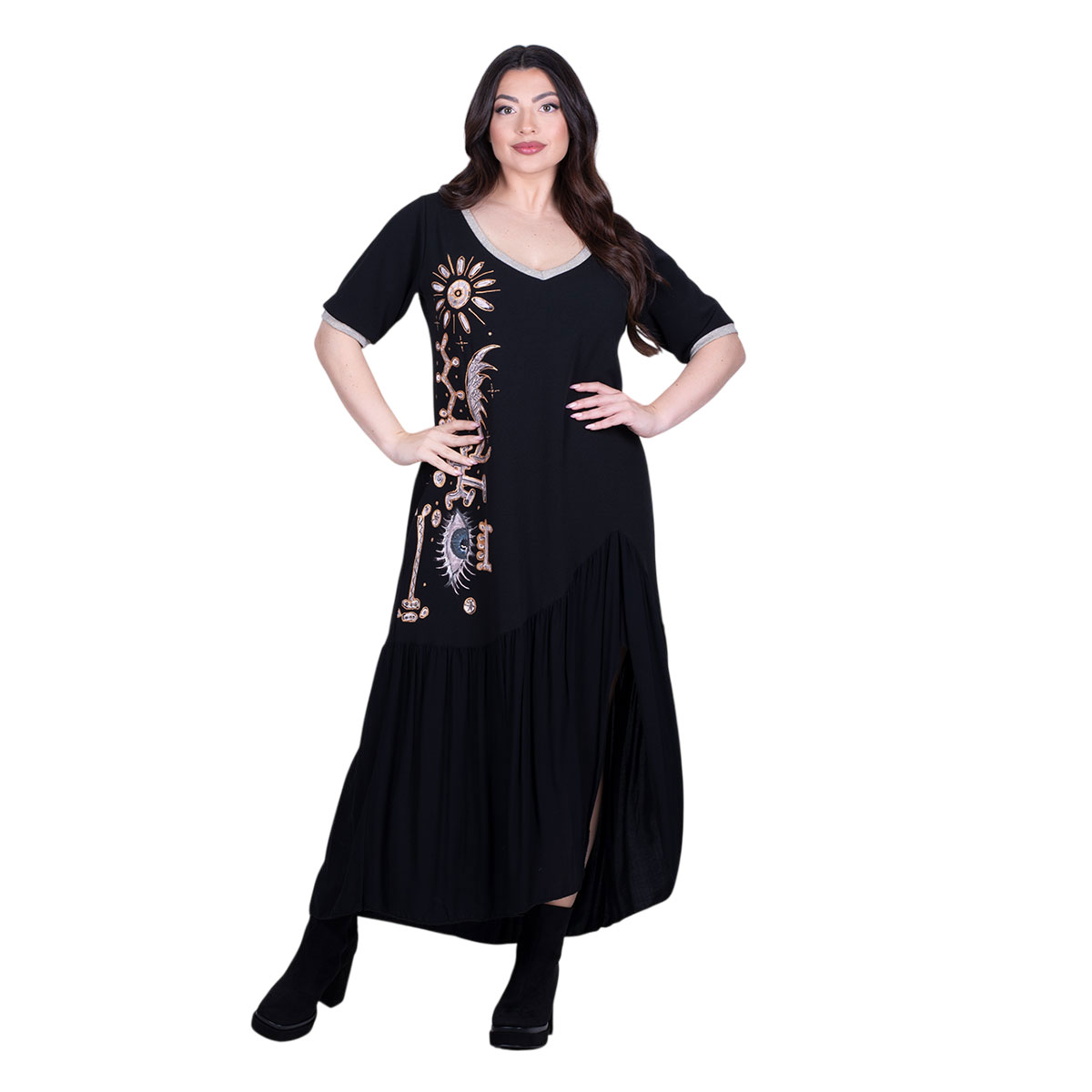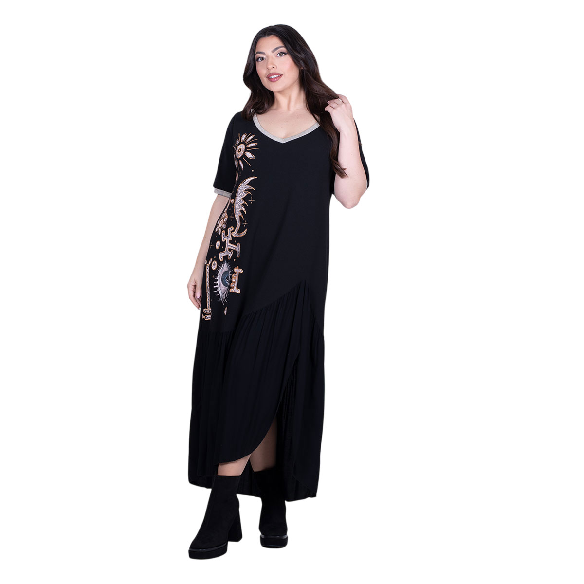 Fairyland Moschato, καθημερινό, φόρεμα μαύρο, γυναικείο, χειμερινό, κοντομάνικο, midi, με V ντεκολτέ, μικρή ασυμμετρία στην αριστερή του πλευρά με σκίσιμο και δύο βολάν. Το τελείωμα στο μανίκι και στο ντεκολτέ, είναι στο χρώμα της άμμου, με λεπτές χρυσές λεπτομέρειες. Στη δεξιά του πλευρά έχει ζωγραφιστό σχέδιο στο χέρι, με χρώματα αδιάβροχα μεταξοτυπίας.
