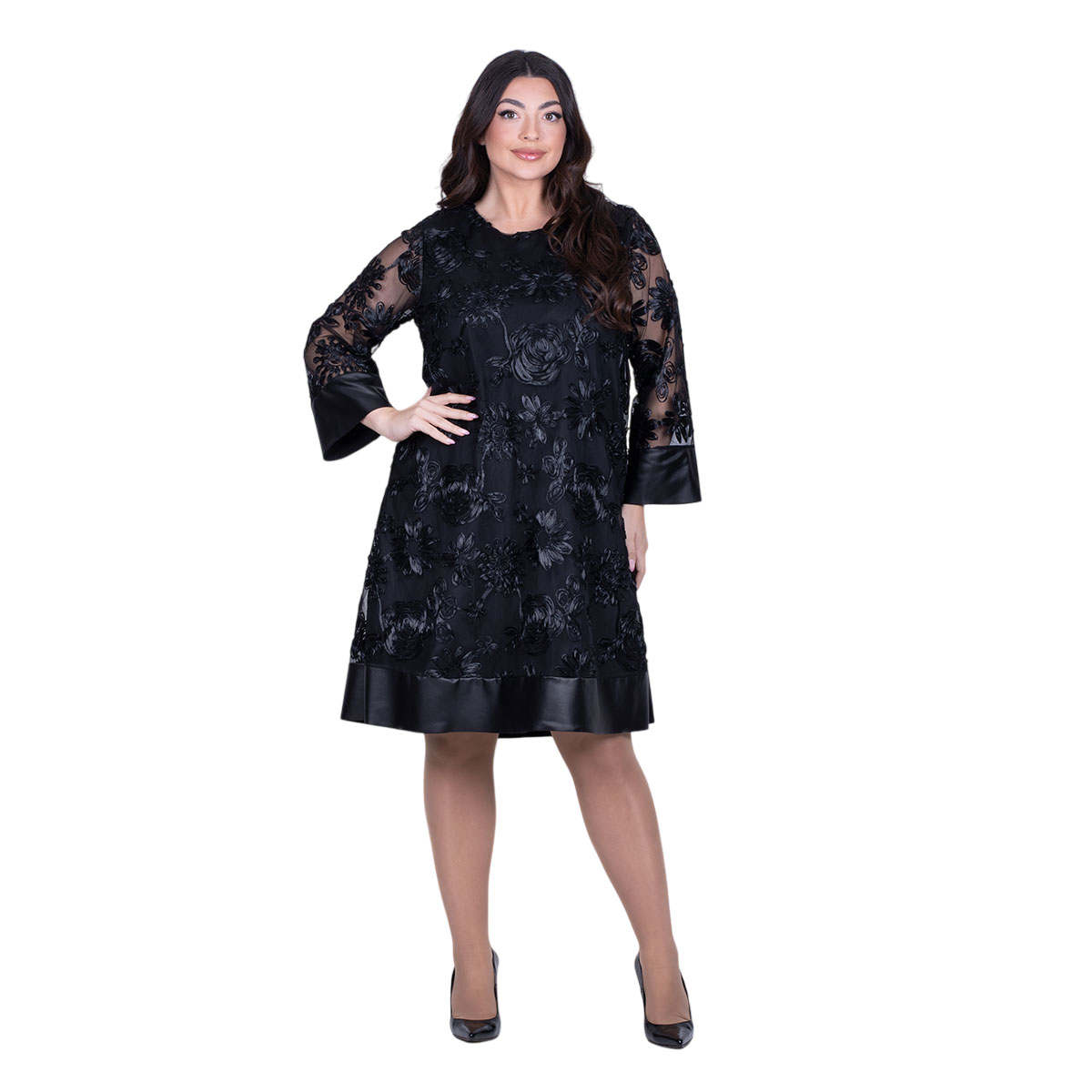Platinum Moschato, εντυπωσιακό, φόρεμα μαύρο, με κεντητό μαύρο σχέδιο λουλουδιών, γυναικείο, με διαφάνεια, άλφα γραμμή, midi, χαμηλή στρογγυλή λαιμόκοψη και φαρδιά μακριά μανίκια με διαφάνεια επίσης. Στα τελειώματα του έχει τρέσα από μαύρη δερματίνη. Εσωτερικά εκτός τα μανίκια, έχει ενσωματωμένο μαύρο ελαστικό ύφασμα.