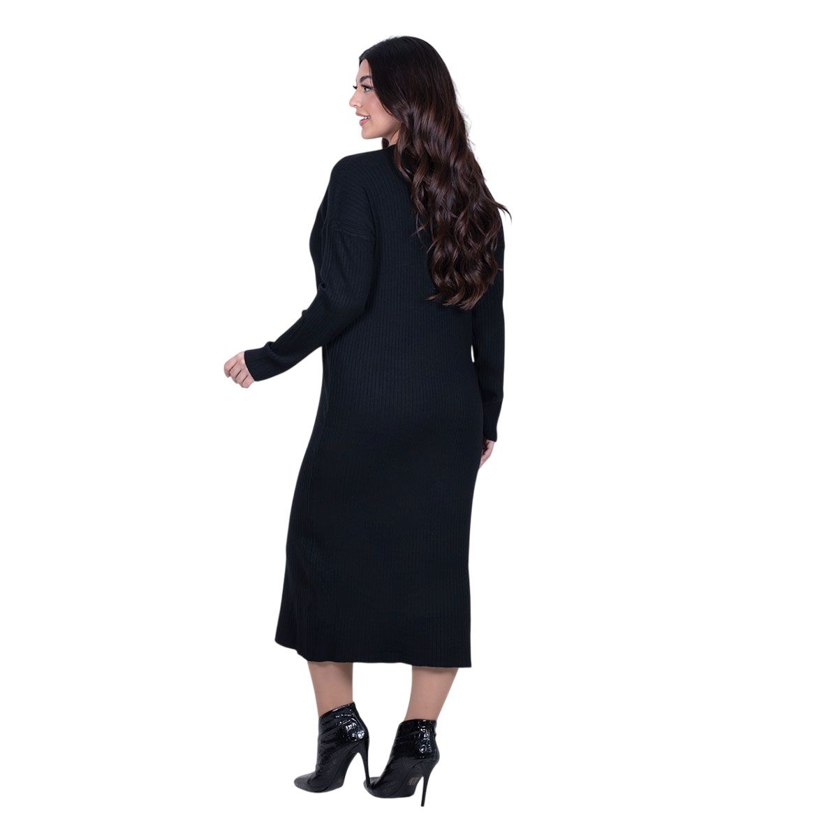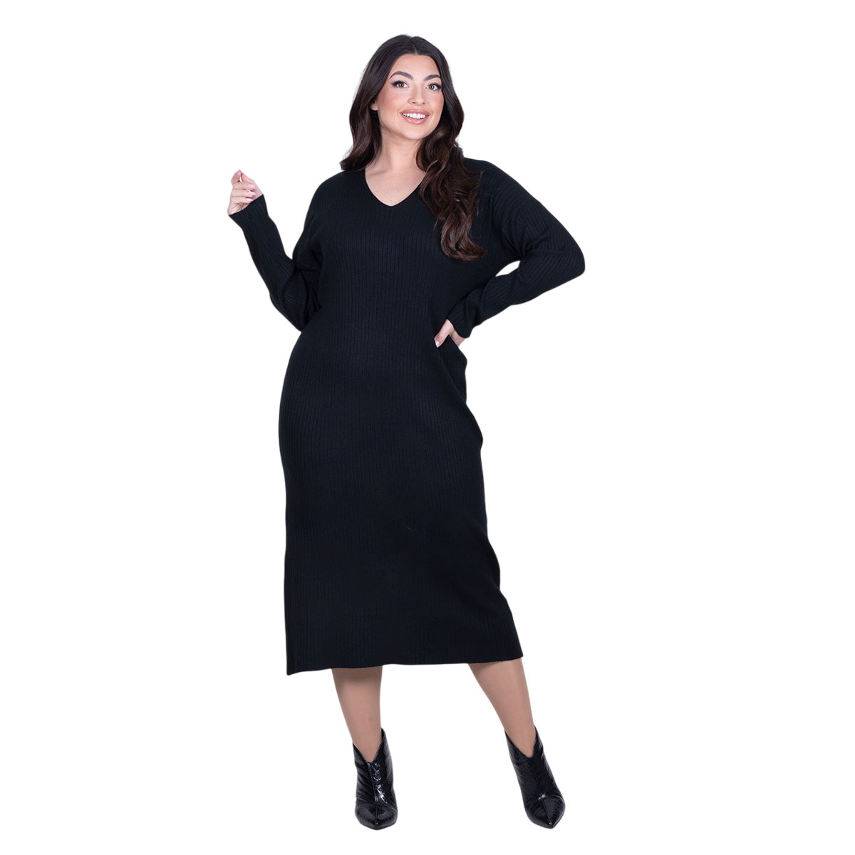 Platinum, στυλάτο, φόρεμα μαύρο, γυναικείο, από λεπτό πλεκτό, midi, ελαστικό, σε ίσια γραμμή, κομψό, με λεπτή μανσέτα λάστιχο στα τελειώματα. Έχει V ντεκολτέ και μακριά μανίκια. Ιδιαίτερα φιλικό με το δέρμα σας!