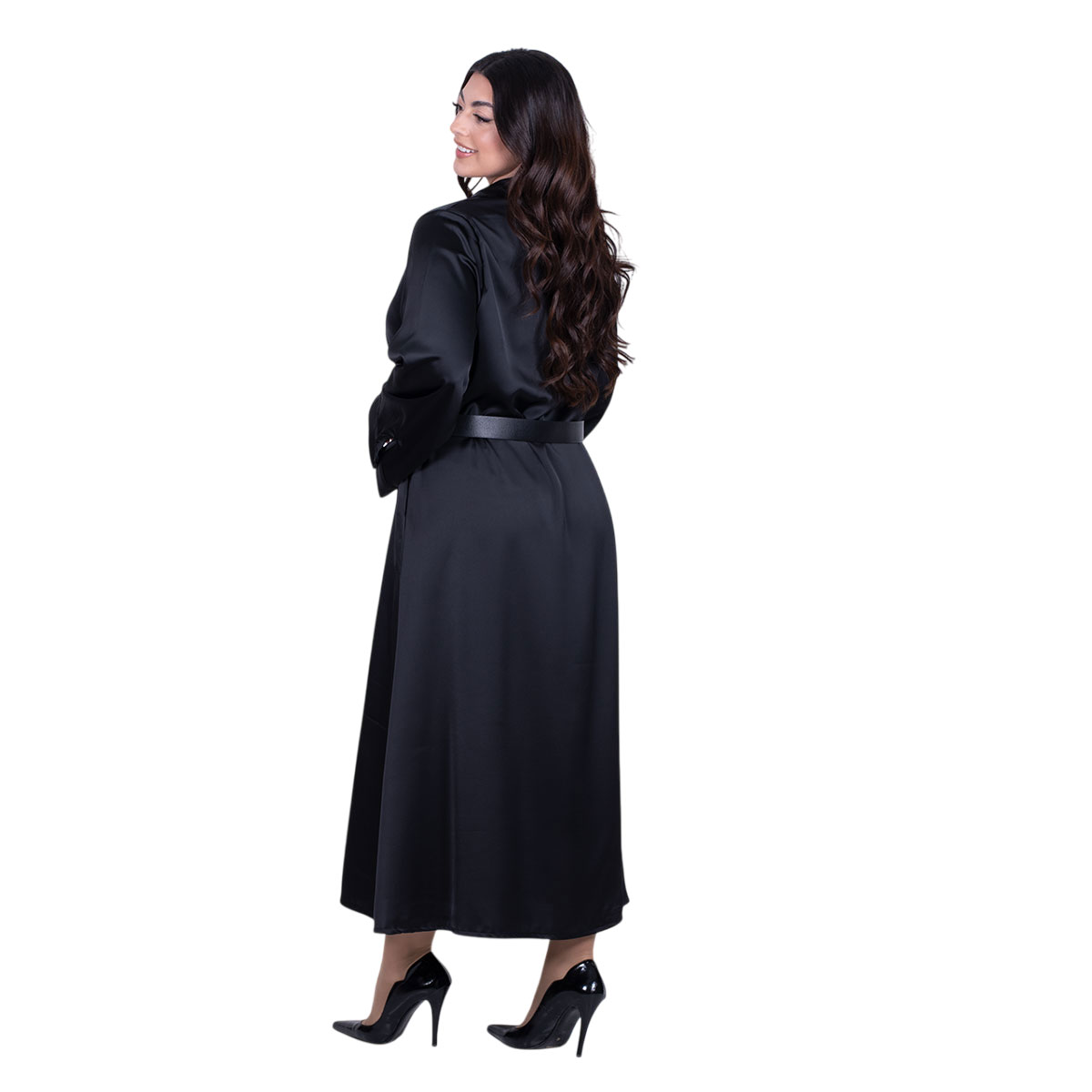 Platinum Moschato, υπέροχο, φόρεμα μαύρο, γυναικείο, σατινέ, άλφα γραμμή, μακρύ, με γιακά, φαρδιά μακριά μανίκια καμπάνα με μανσέτα με κουμπί και κλείνει με 11 κουμπιά. Στα πλαϊνά του έχει εσωτερικές τσέπες. Φορέστε με λεπτή ή φαρδιά ζώνη, μα και χωρίς!