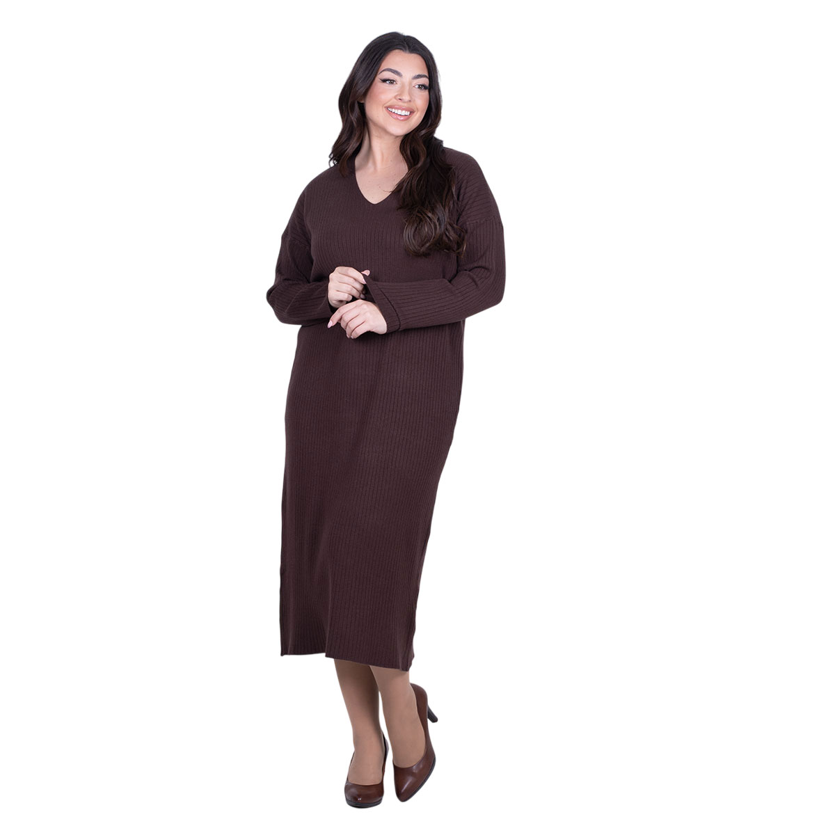 Platinum, στυλάτο, φόρεμα καφέ, γυναικείο, από λεπτό πλεκτό, midi, ελαστικό, σε ίσια γραμμή, κομψό, με λεπτή μανσέτα λάστιχο στα τελειώματα. Έχει V ντεκολτέ και μακριά μανίκια. Ιδιαίτερα φιλικό με το δέρμα σας!