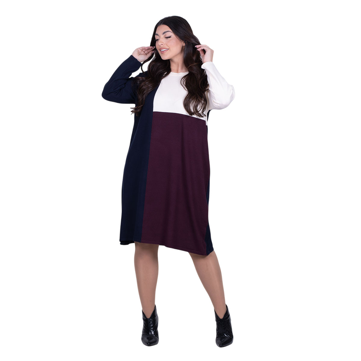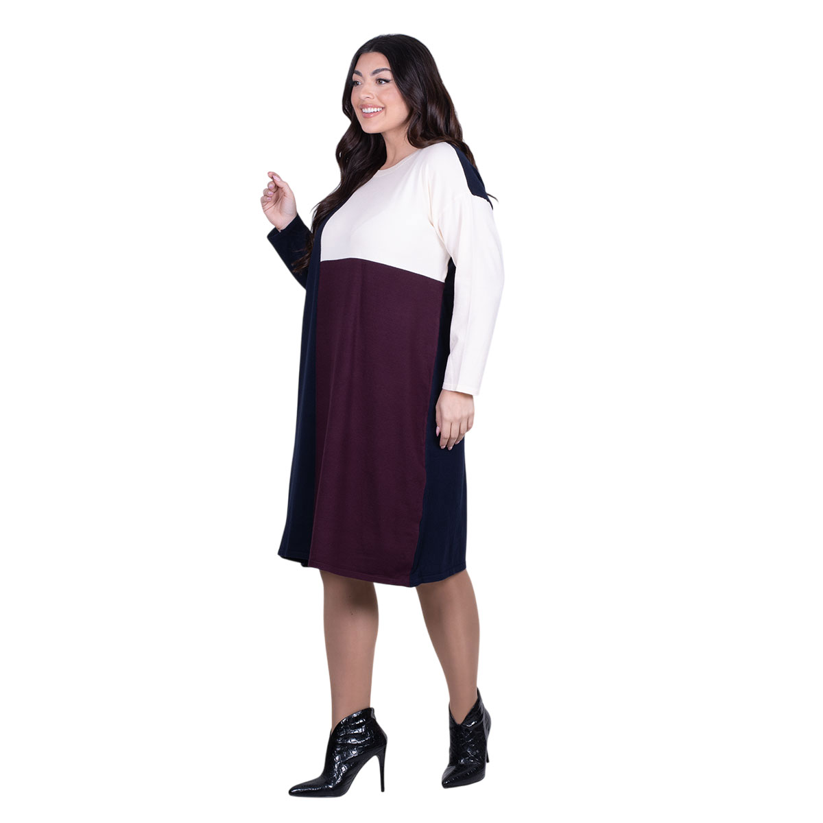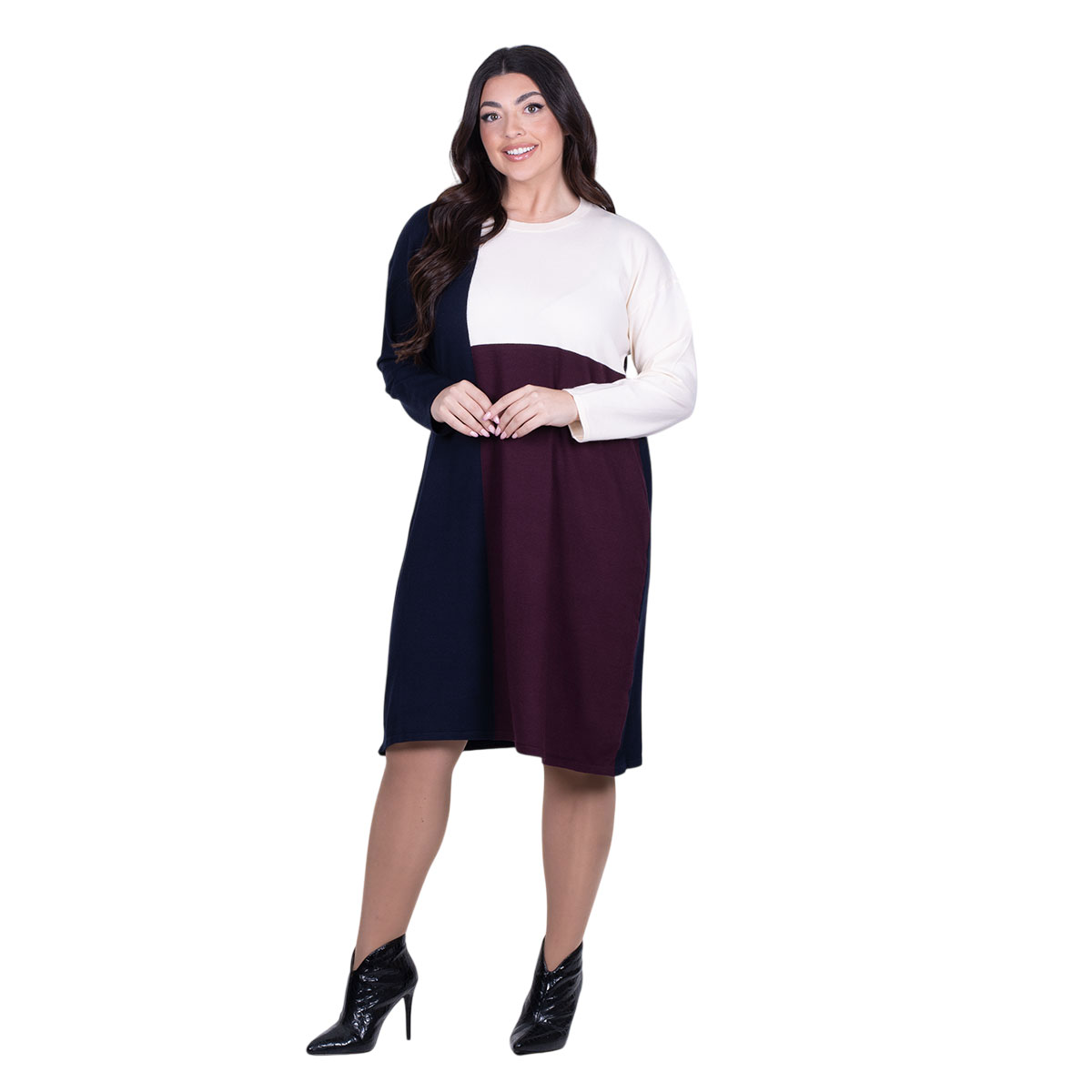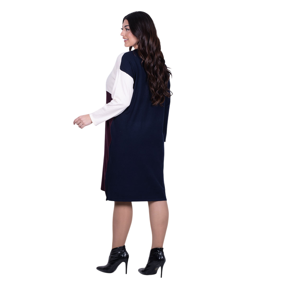 Platinum, στιλάτο, φόρεμα σε τριχρωμία χρωμάτων του μπλε, δαμασκνηνί και εκρού, γυναικείο, από λεπτό πλεκτό, midi, ελαστικό, σε ίσια γραμμή, κομψό, στρογγυλή λαιμόκοψη και μακριά μανίκια. Ιδιαίτερα φιλικό με το δέρμα σας!