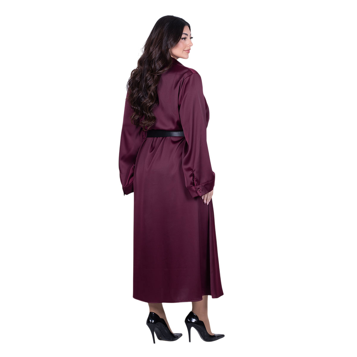 Platinum Moschato, υπέροχο, φόρεμα μπορντό, γυναικείο, σατινέ, άλφα γραμμή, μακρύ, με γιακά, φαρδιά μακριά μανίκια καμπάνα με μανσέτα με κουμπί και κλείνει με 11 κουμπιά. Στα πλαϊνά του έχει εσωτερικές τσέπες. Φορέστε με λεπτή ή φαρδιά ζώνη, μα και χωρίς!
