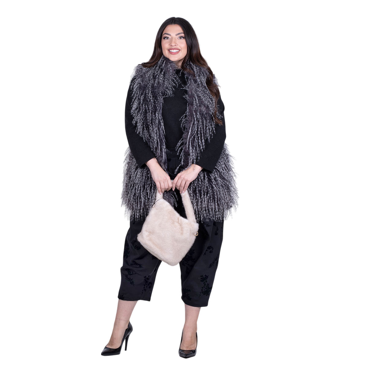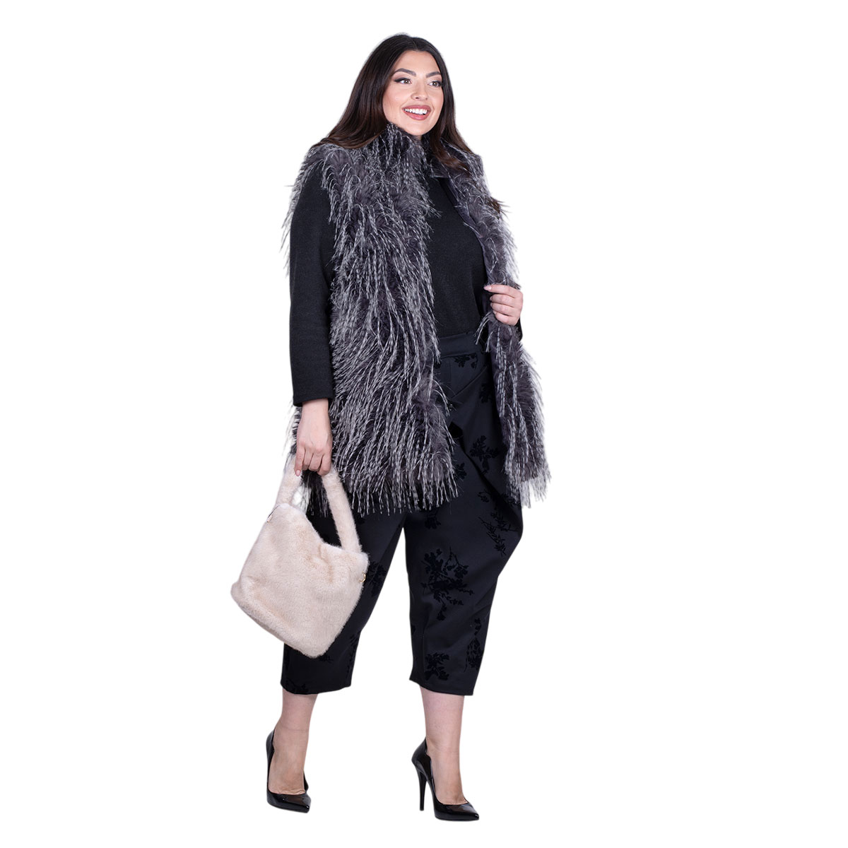 Fairyland Moschato, υπέροχο, γιλέκο γκρι σκούρο γούνινο, με λευκό χνουδωτό σχέδιο, οικολογικό, γυναικείο, χειμωνιάτικο, μακρύ και εσωτερικές τσέπες στα πλαϊνά του. Στο μπούστο έχει δύο εσωτερικά κουμπώματα με κόπιτσες.