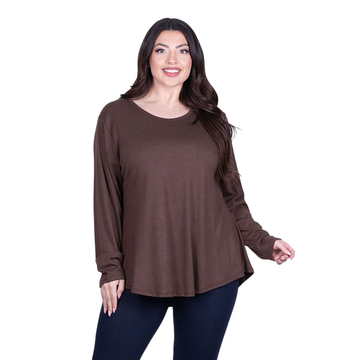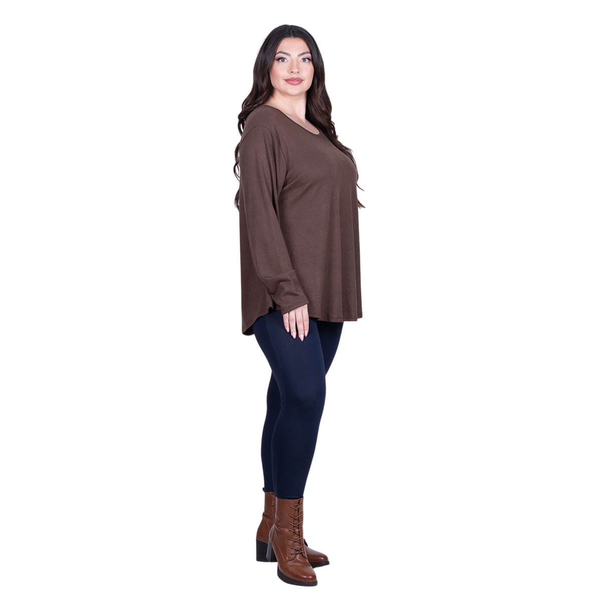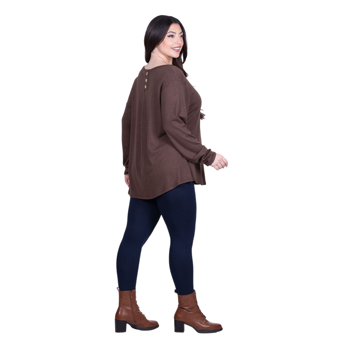 Fairyland Moschato, καθημερνή, μπλούζα σε καφέ χρώμα, γυναικεία, φαρδιά, λεπτή, με μικρή οβαλ λαιμόκοψη, εβαζέ, με λίγο κλος, μακριά μανίκια και μικρή ασυμμετρία στο πίσω μέρος της.