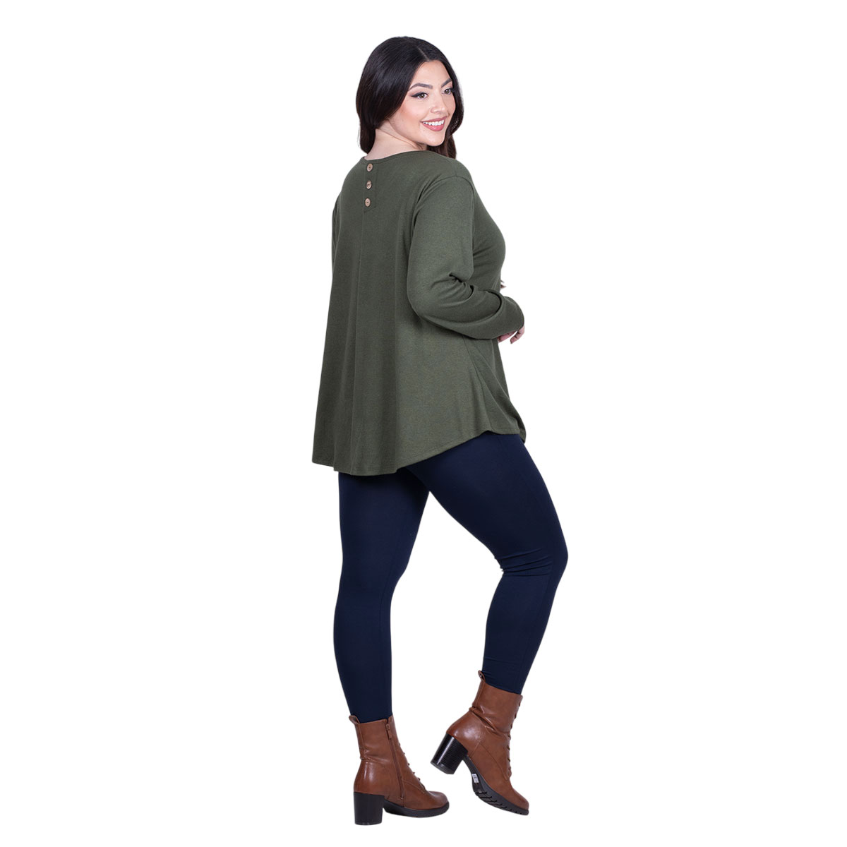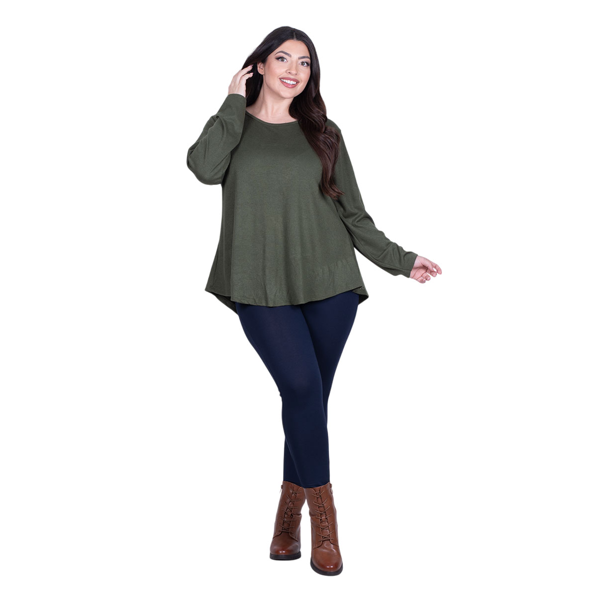 Fairyland Moschato, καθημερνή, μπλούζα σε λαδί χρώμα, γυναικεία, φαρδιά, λεπτή, με μικρή οβάλ λαιμόκοψη, εβαζέ, με λίγο κλος, μακριά μανίκια και μικρή ασυμμετρία στο πίσω μέρος της.