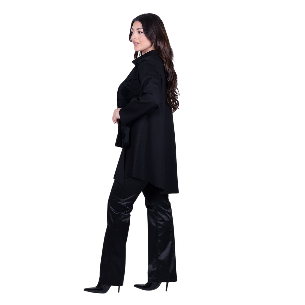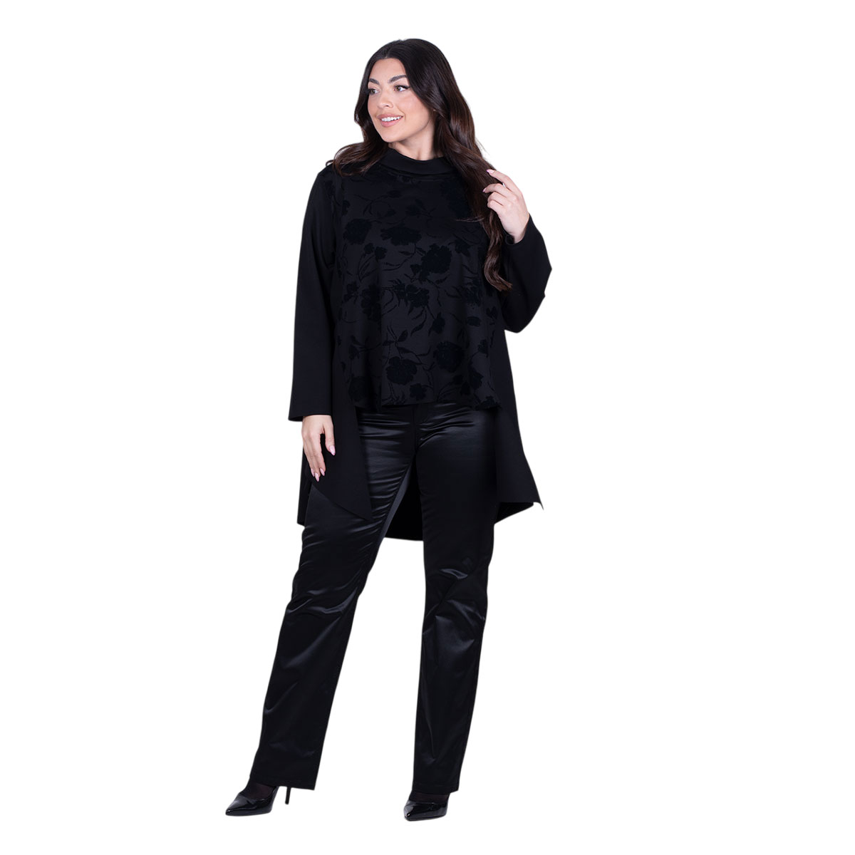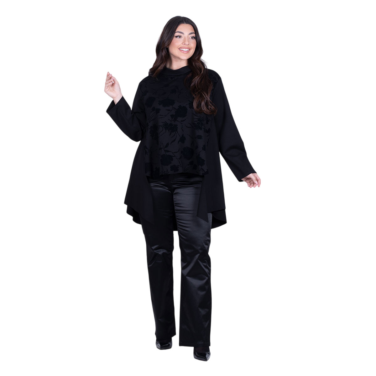 Fairyland Moschato, ιδιαίτερη, μπλούζα μαύρη, με διακριτικές floral print λεπτομέρειες στο μπροστινό της μέρος, γυναικεία, μακριά, ασύμμετρη, με μακριά μανίκια. Έχει αναδιπλώμενη στρογγυλή λαιμόκοψη και στα πλαϊνά της ”κλοσάρει”.