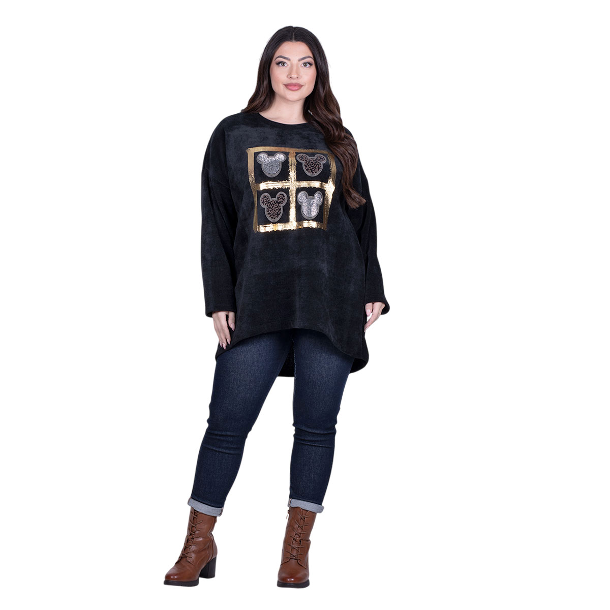 Fairyland Μπλούζα Μαύρη Γυναικεία Ασύμμετρη Velvet Με Mickey Mouse Casoual All Day Free Size – FM-2504-BC