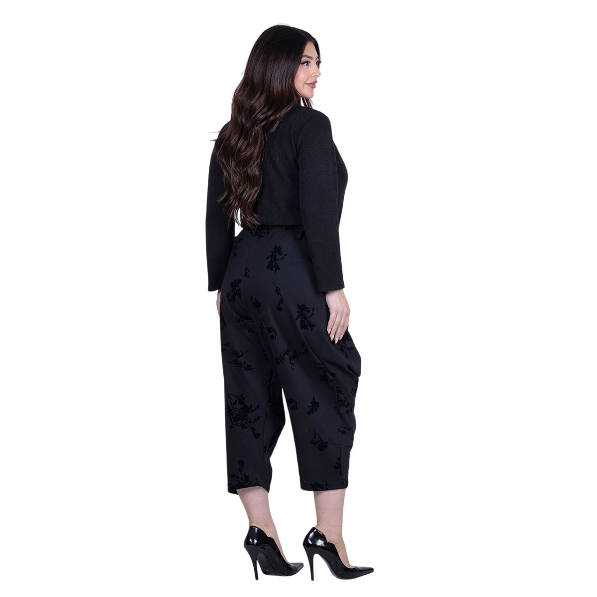 Fairyland Moschato, ιδιαίτερη, παντελόνι – βράκα μαύρη, γυναικεία, με ανάγλυφα floral μαύρα σχέδια και άνεση στο σώμα. Έχει λάστιχο στη μέση και θυλάκια για ζώνη. Στη μπροστινή της μεριά, κάνει σχέδιο που κλείνει με κουμπί.