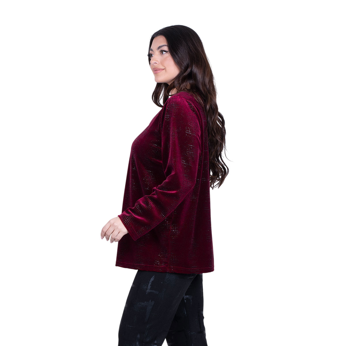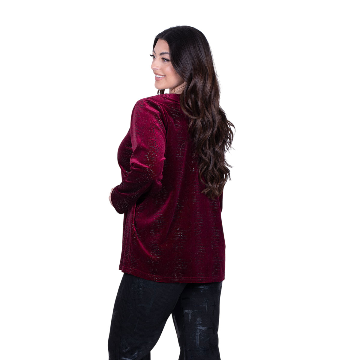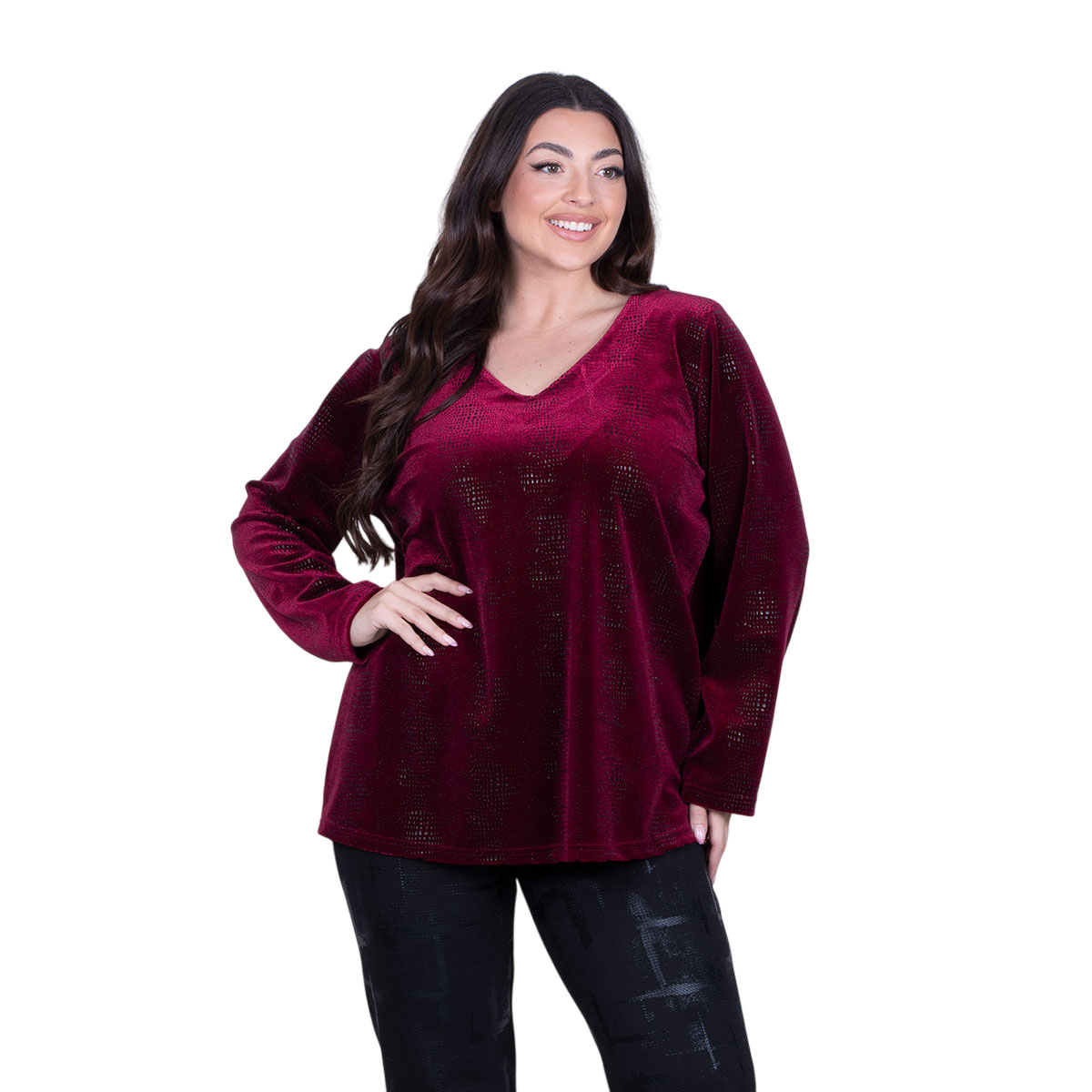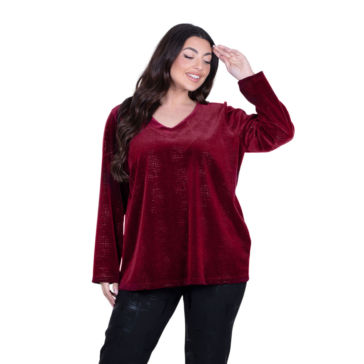 Gomore, ιδιαίτερη, μπλούζα μπορντοκόκκινη, γυναικεία, βραδινή, σε ίσια γραμμή, με V ντεκολτέ και πτι μαύρα σχέδια στην ύφανση του. Φοριέται κατά τη διάρκεια όλης της ημέρας και με παντελόνι! Διατίθεται επίσης σε σκούρο μπλε και σε μαύρο χρώμα.