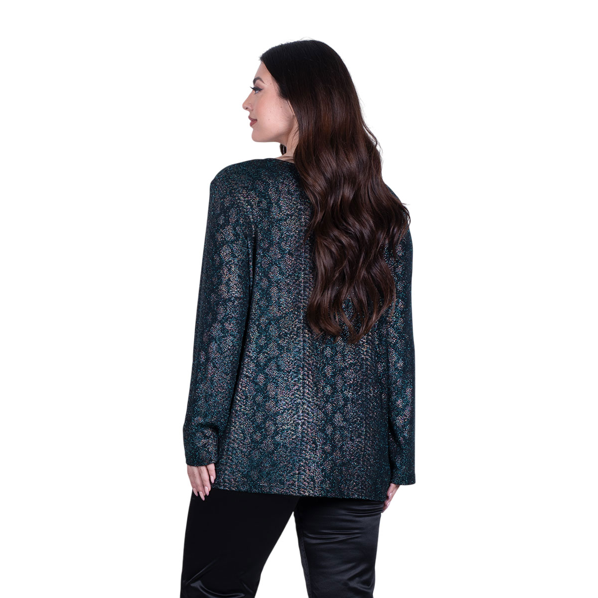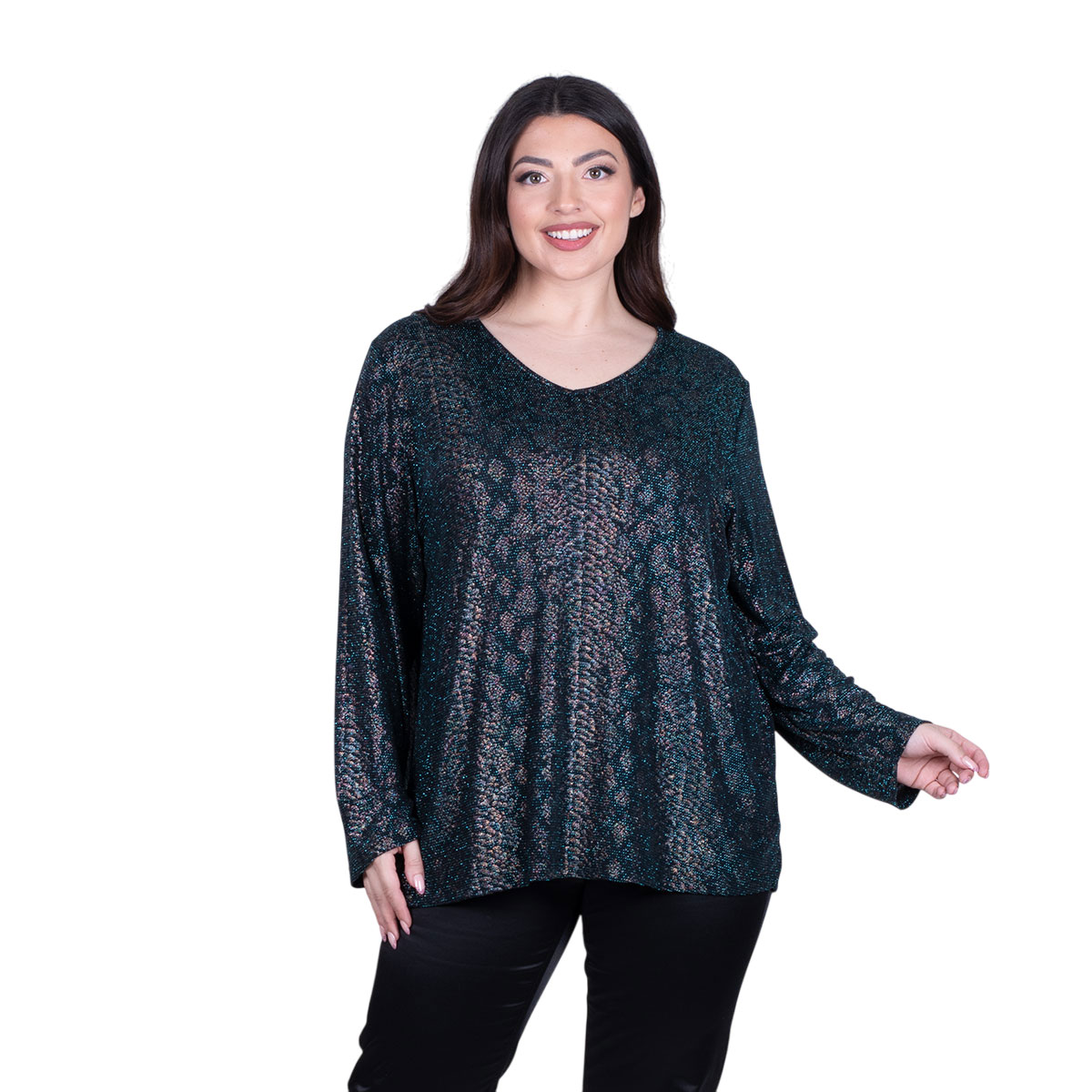 Gomore, εντυπωσιακή, μπλούζα πράσινη, γυναικεία, βραδινή, σε ίσια γραμμή, V ντεκολτέ και μελανζέ σχέδιο στην ύφανση της. Πέφτει πολύ όμορφα στο σώμα!