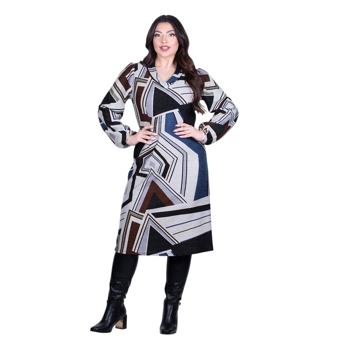 Platinum, καθημερινό, φόρεμα γκρι, με πολύχρωμα γεωμετρικά σχέδια, γυναικείο, χειμωνιάτικο, μακρυμάνικο, με μικρό V ντεκολτέ και γιακά, σε ίσια γραμμή.