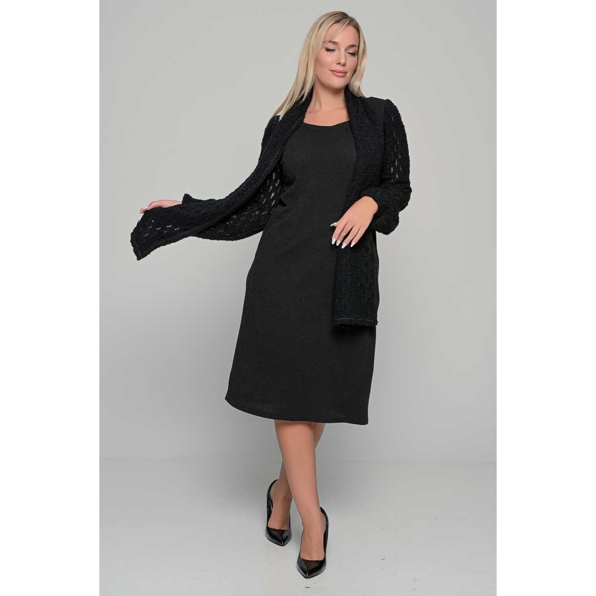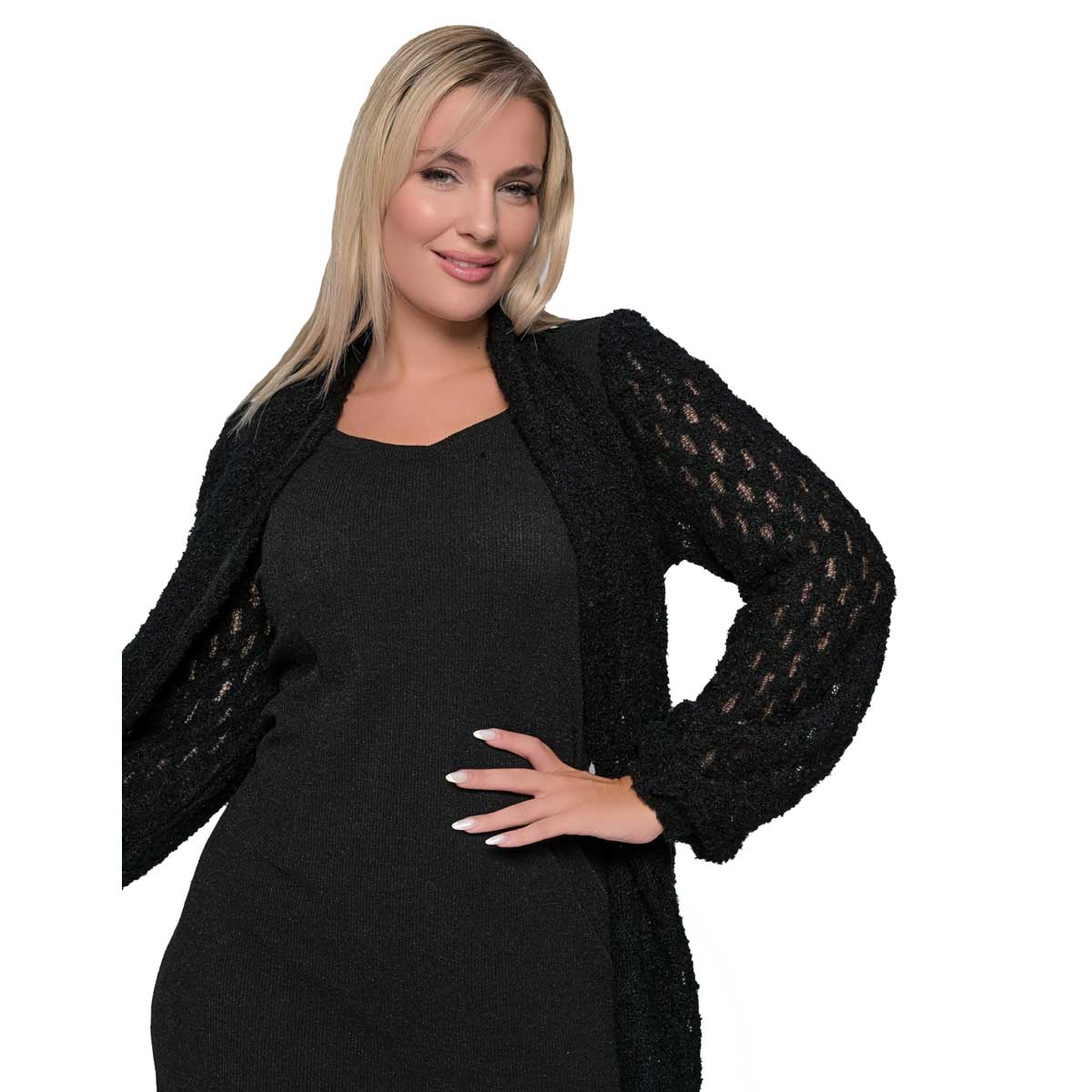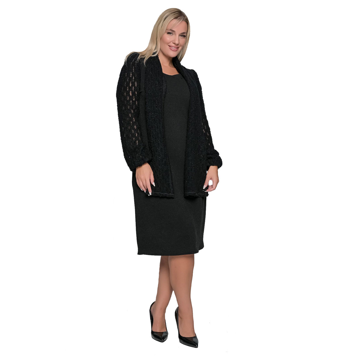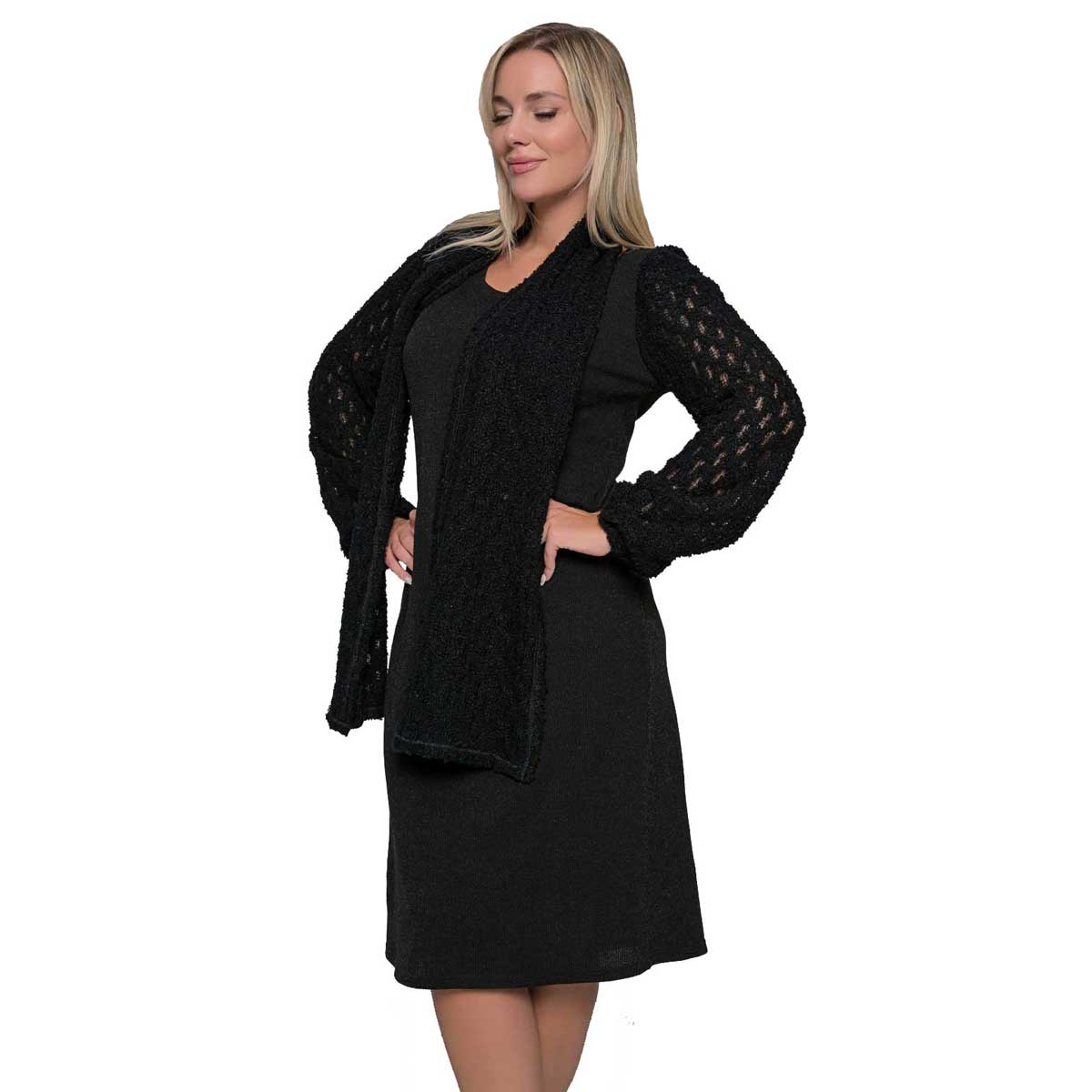 Platinum, καθημερινό, φόρεμα μαύρο, με σχέδιο στα μανίκια και στο κασκόλ, από πλεκτή ελαστκή δαντέλα, γυναικείο, χειμωνιάτικο, μακρυμάνικο, με στρογγυλή λαιμόκοψη, σε ίσια γραμμή. Τα μανίκια του είναι μακριά και φαρδιά και στο τελείωμα τους έχουνε λάστιχο.