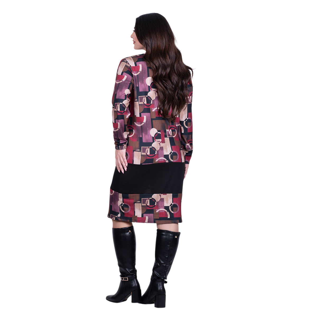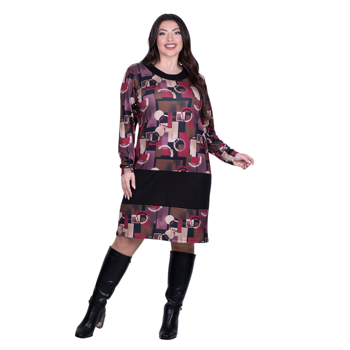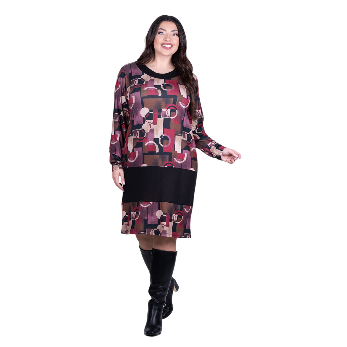 Platinum, καθημερινό, φόρεμα μωβ – ροζ, με γήινα και παλ εμπριμέ σχέδια, γυναικείο, μακρυμάνικο, με χαμηλή στρογγυλή λαιμόκοψη, σε ίσια γραμμή.