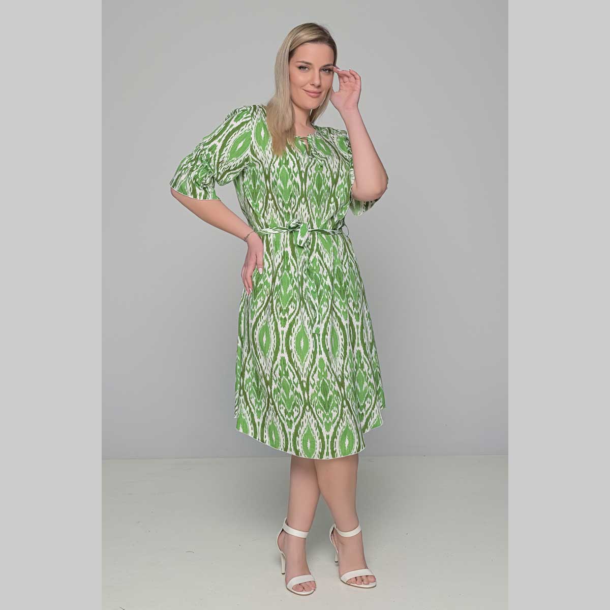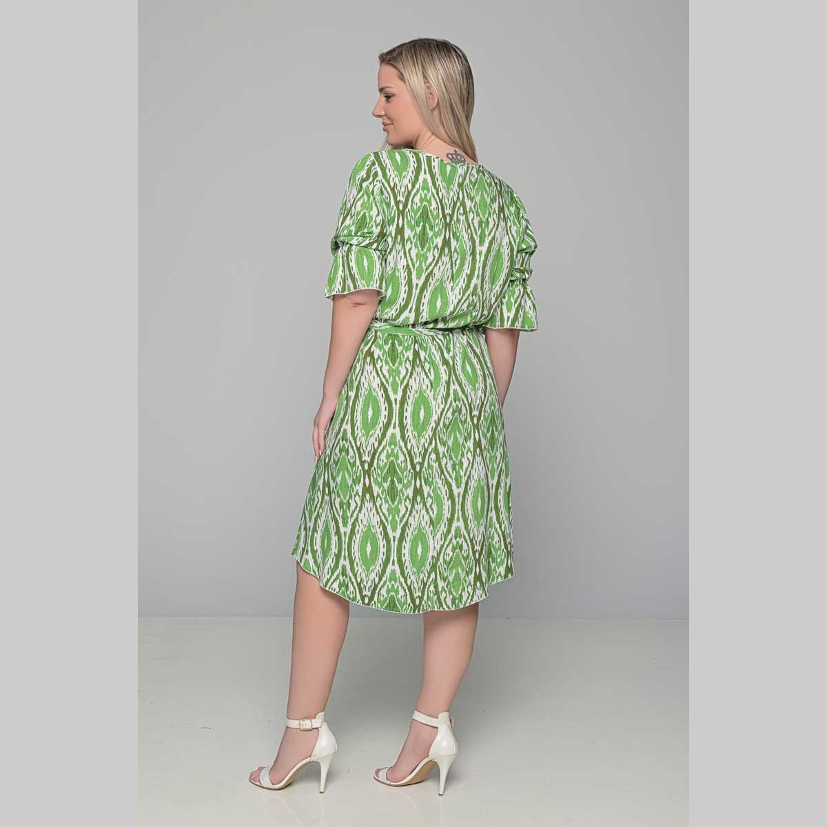 Gomore Φόρεμα Πράσινο Με Εμπριμέ Γυναικείο Midi Εβαζέ Με Ζώνη Τρουακαρ All Day – 52671-GR