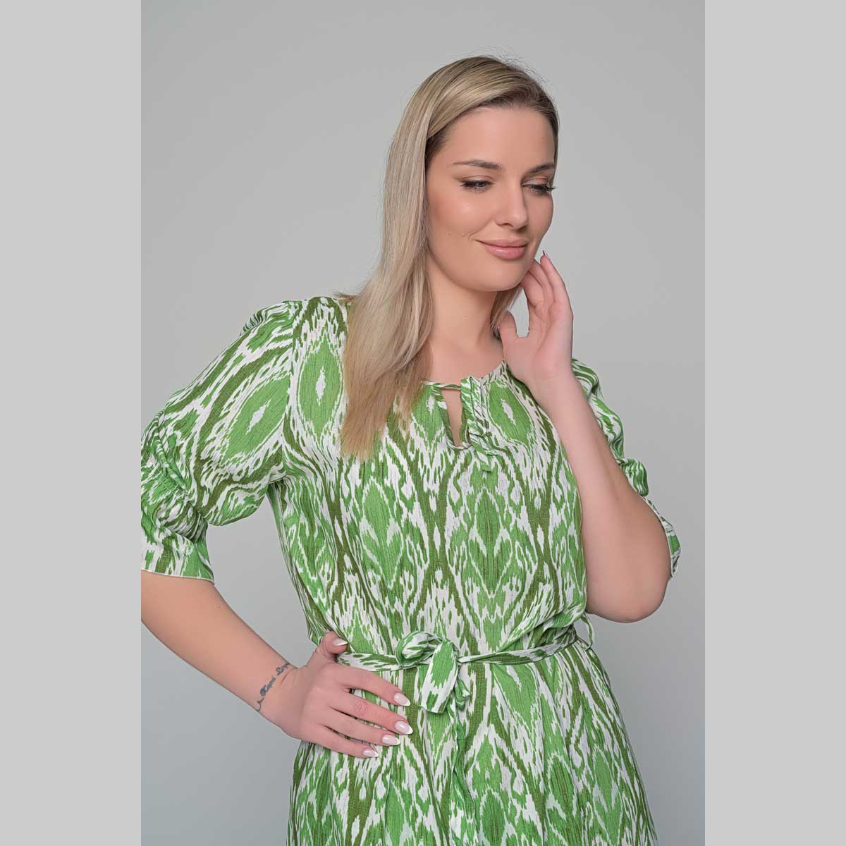 Gomore, άνετο, φόρεμα πράσινο, γυναικείο, midi, με δέσιμο στη λαιμόκοψη, σε εβαζέ γραμμή με ζώνη από το ίδιο ύφασμα στη μέση και μανίκια τρουακαρ με λάστιχο σούρα. Όμορφο φόρεμα, που αγκαλιάζει το σώμα σας και ατσαλάκωτο ύφασμα !!!