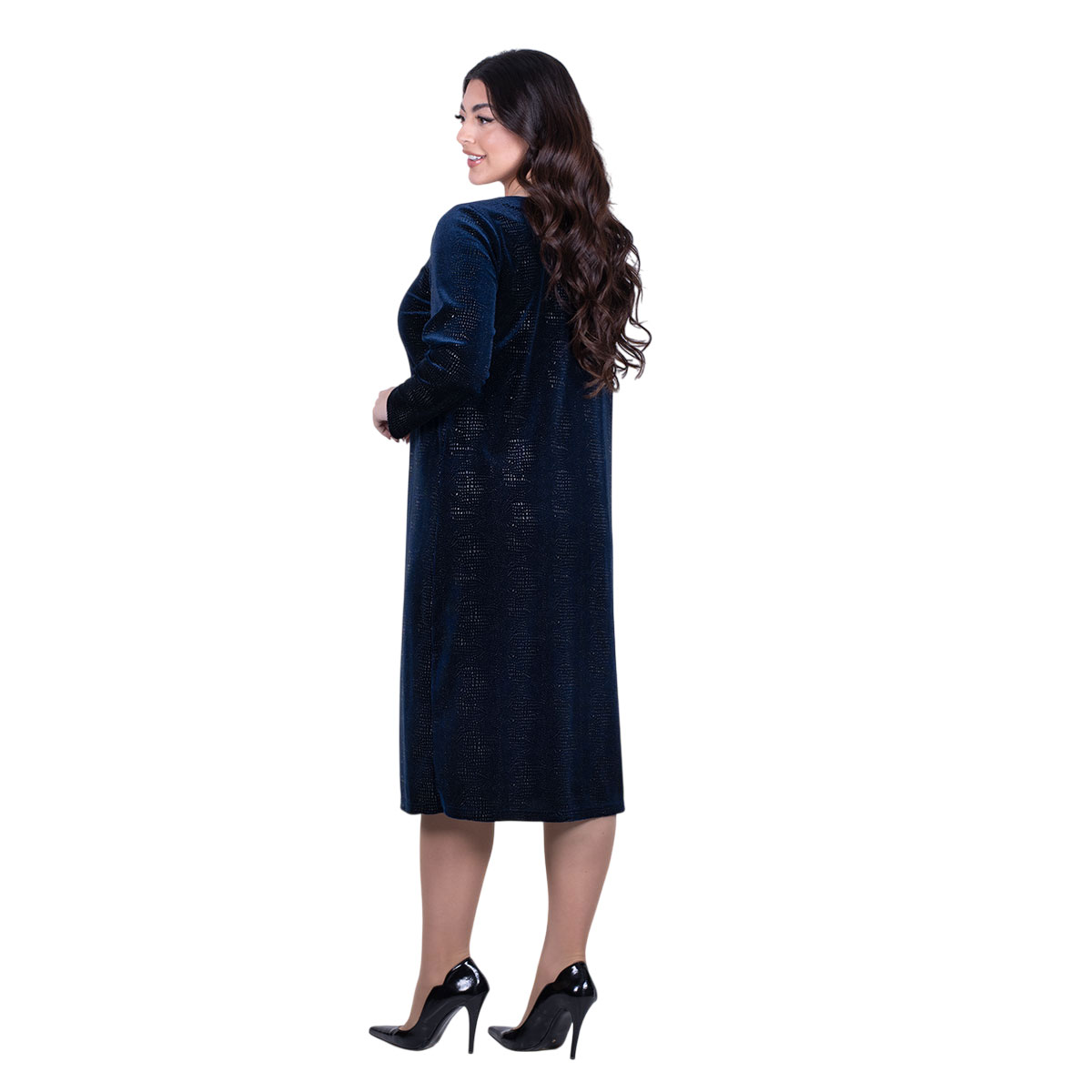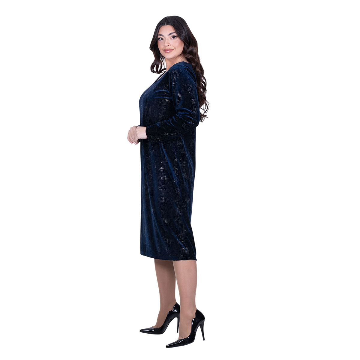 Platinum, χειμωνιάτικο, γυναικείο, βραδινό, midi, μακρυμάνικο, μπλέ σκούρο φόρεμα με V ντεκολτέ και πτι μαύρα σχέδια στην ύφανση του. Πανέμορφο φόρεμα, για εντυπωσιακές βραδυνές εξόδους, όπως και για γάμους και για βαπτίσεις.