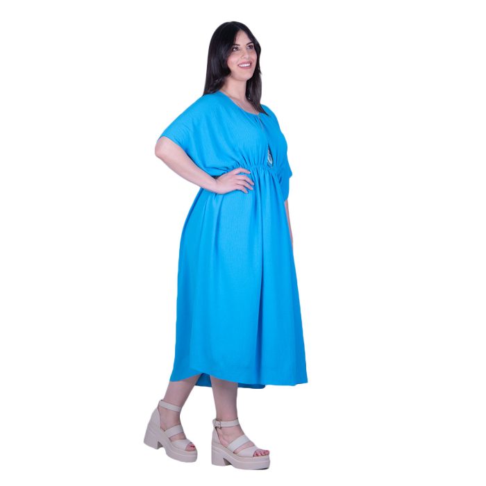 Gomore, άνετο, φόρεμα τυρκουάζ, με γκοφρέ ύφανση, γυναικείο, maxi, με οβαλ ντεκολτέ, σε ίσια γραμμή με πλούσια σούρα στη μέσηκαι κοντά μανίκια χωρίς μανικοκόλληση. Όμορφο φόρεμα, που αγκαλιάζει το σώμα σας και ατσαλάκωτο ύφασμα !!!