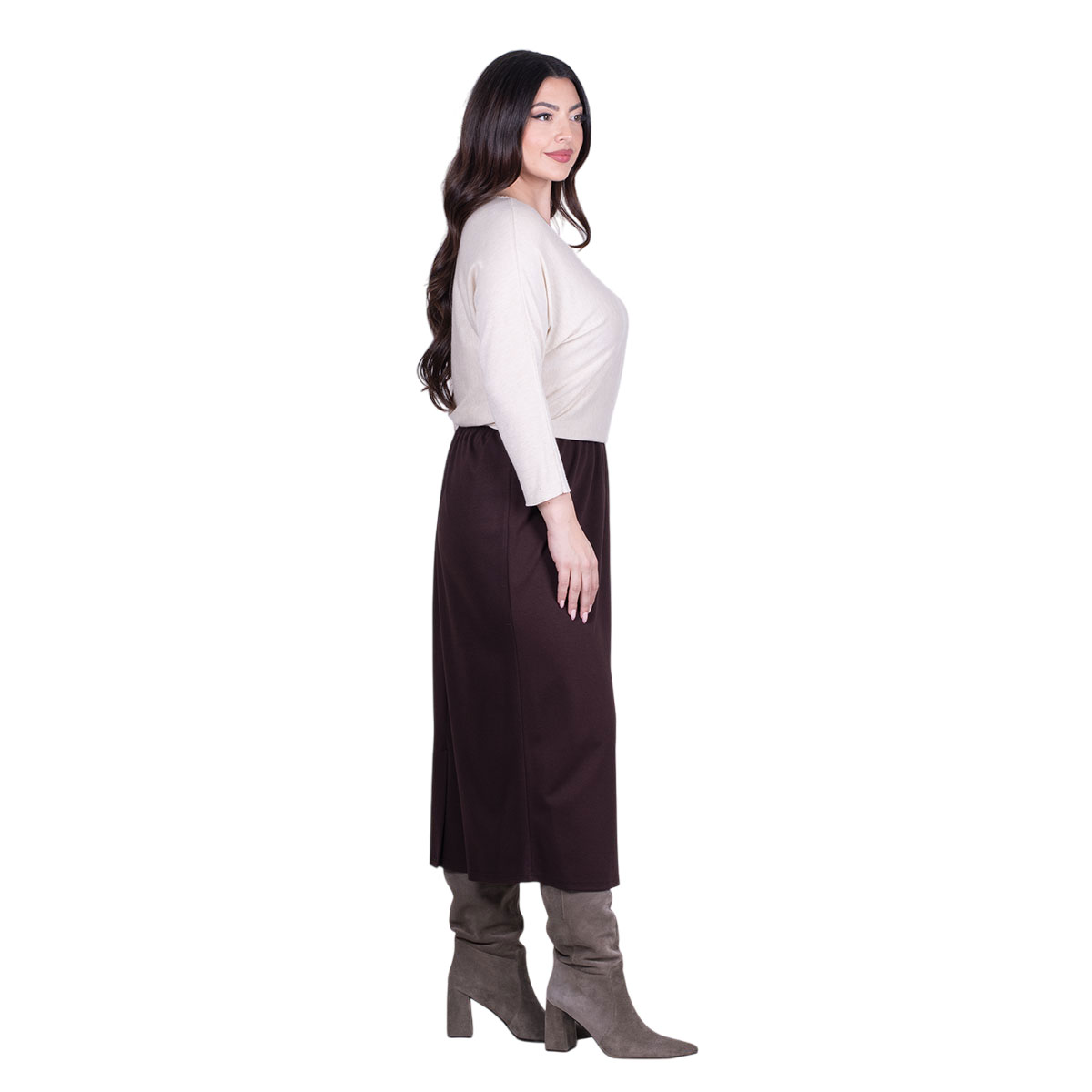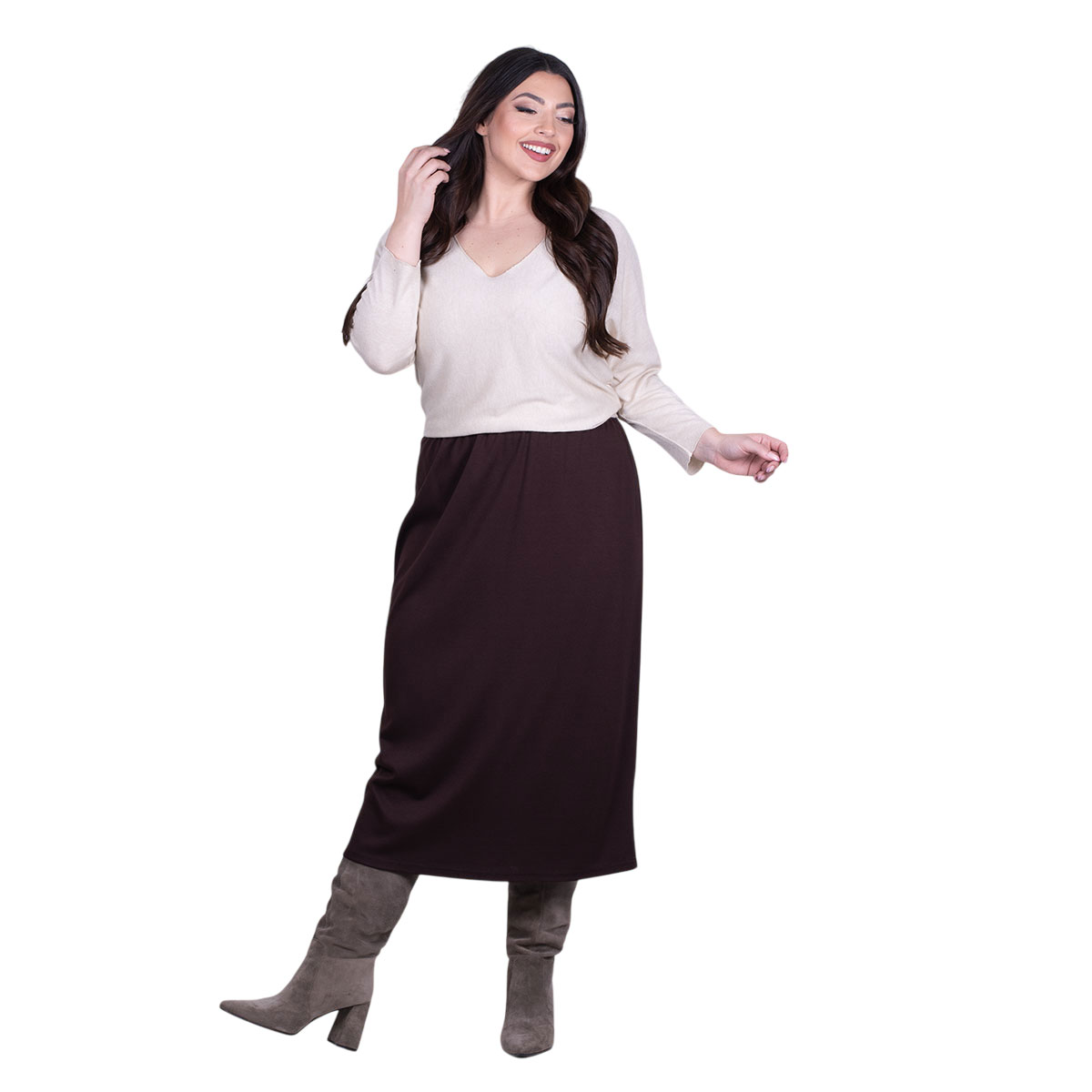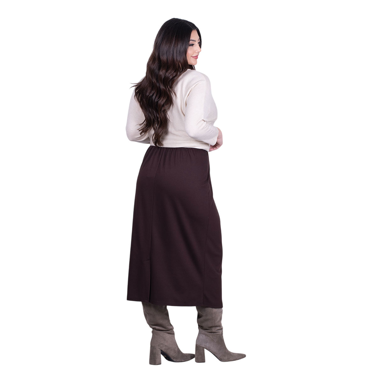 Gomore , καθημερινή, καφέ φούστα, γυναικεία, κλασική, μακριά, σε ίσια γραμμή. Στη μέση της, έχει γαζωμένο λάστιχο για καλύτερη εφαρμογή. Στο πίσω μέρος της, έχει άνοιγμα 25 cm.