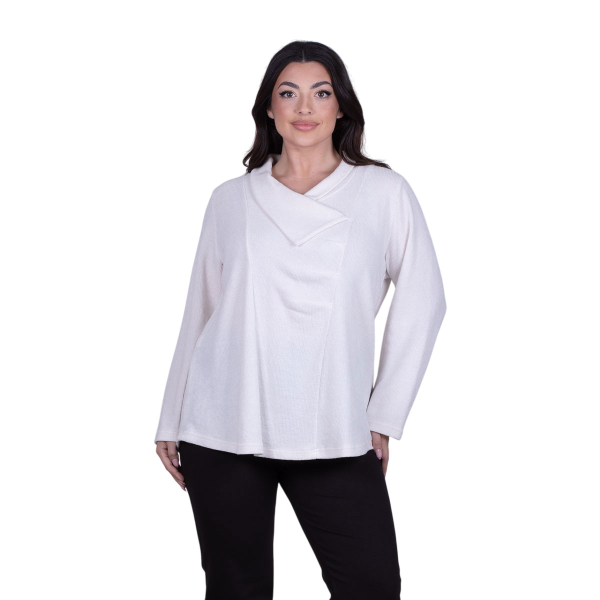 Gomore, καθημερινή, μπλούζα εκρού, γυναικεία, μακρυμάνικη, χειμωνιάτικη, με αναδιπλούμενο γιακά και πιέτες στο μπούστο της.