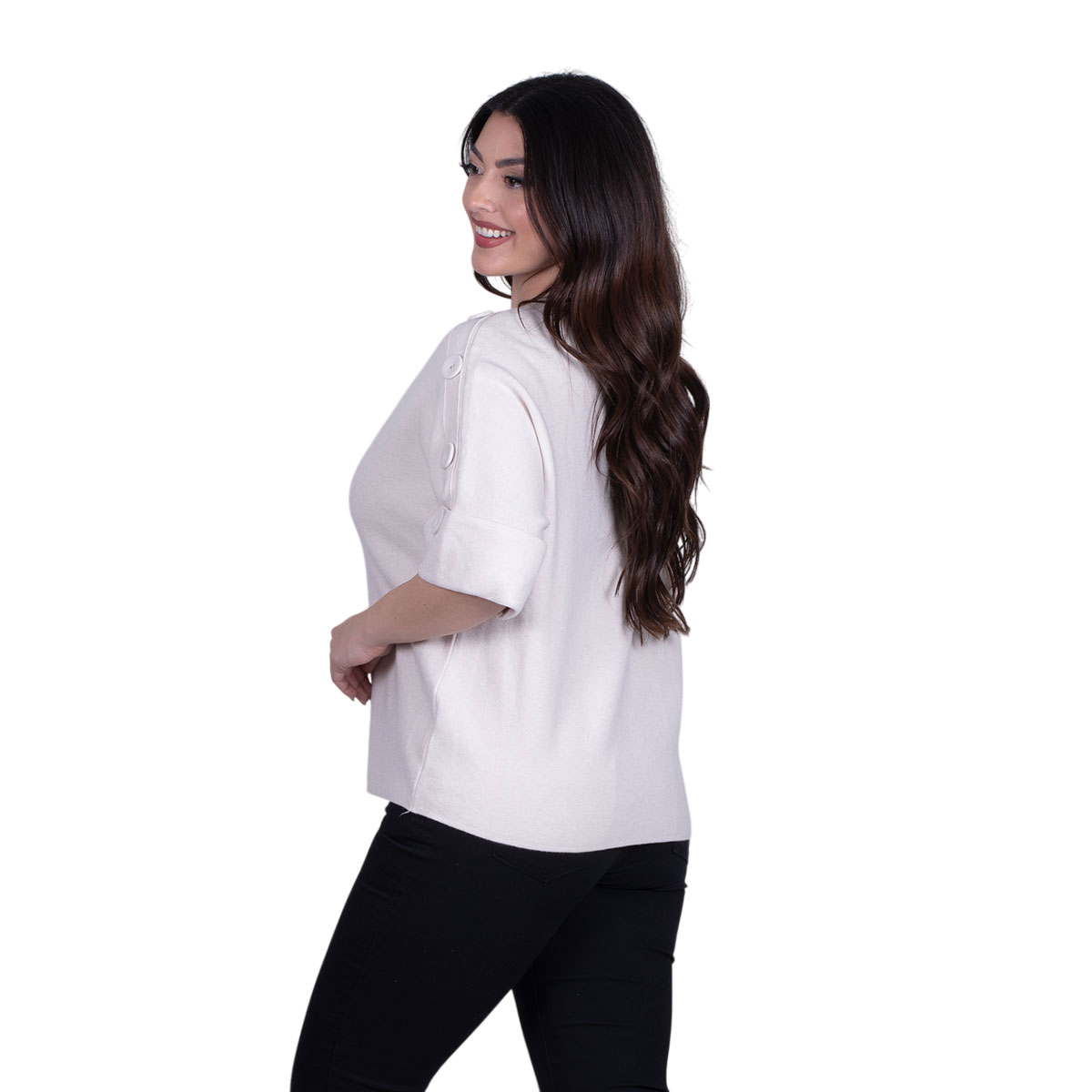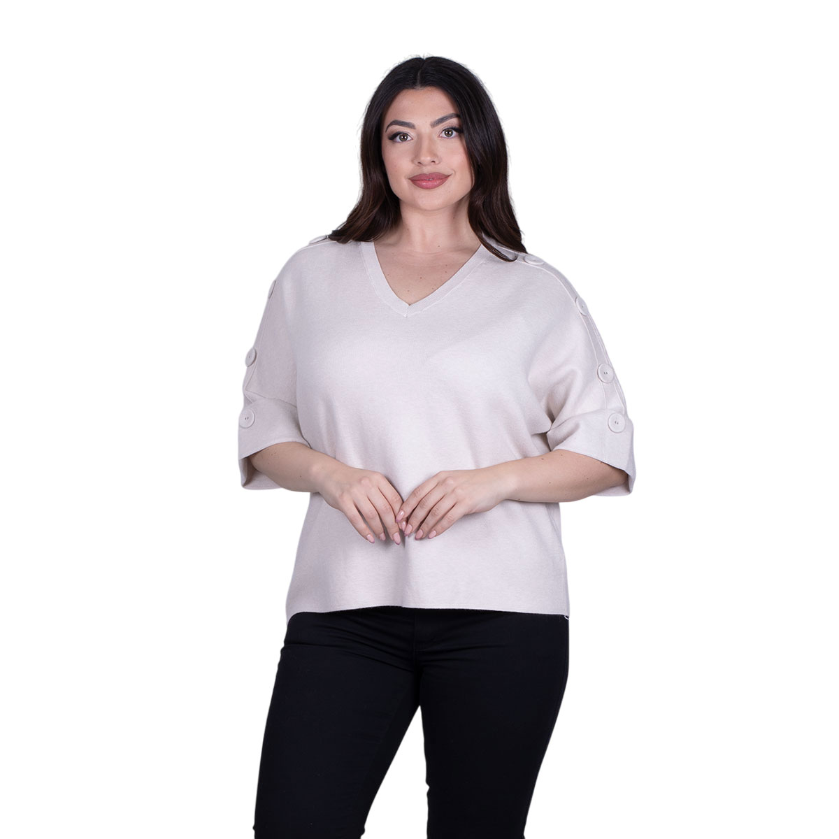 Gomore, καθημερινή, μπλούζα εκρού, γυναικεία, με V ντεκολτέ, από λεπτό πλεκτό, μανίκια χωρίς μανικοκόλληση, τρουακάρ με ρεβέρ, σε άνετη γραμμή! Στο μήκος των ώμων έως το τελείωμα του μανικιού έχει σχέδιο με 4 ντυμένα κουμπιά.