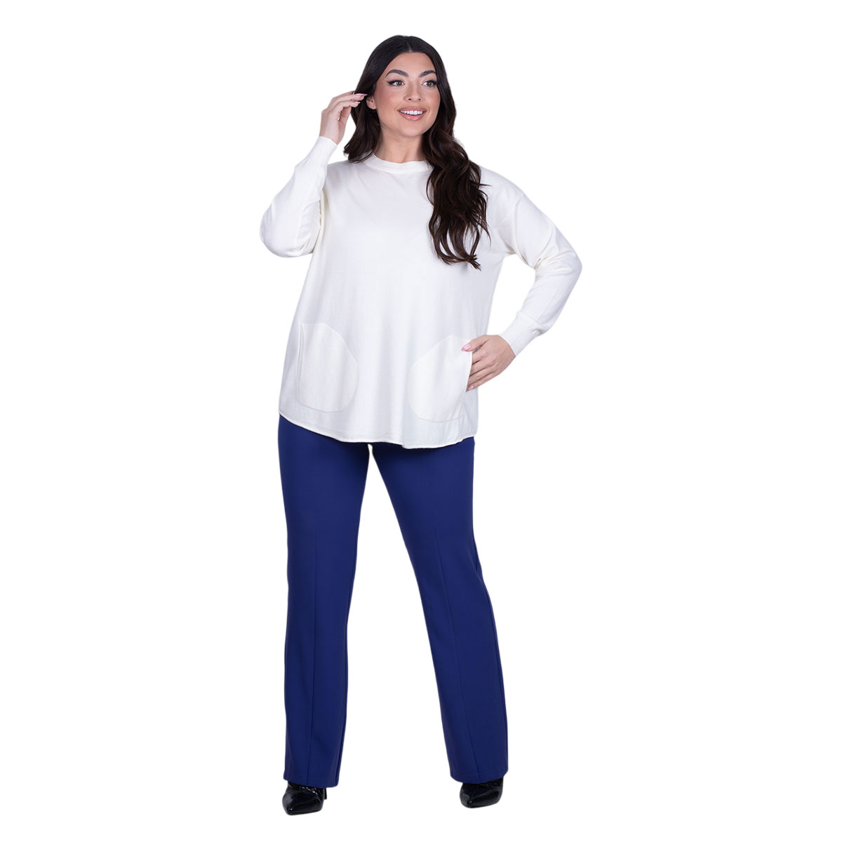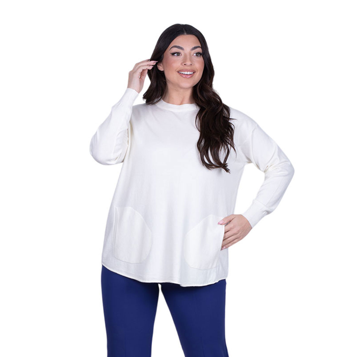 Gomore, καθημερινή, μπλούζα εκρού, γυναικεία, κλασική, με στρογγυλή λαιμόκοψη, από λεπτό πλεκτό, μακριά μανίκια, σε άνετη άλφα γραμμή! Στο μπροστινό της μέρος έχει δύο εξωτερικές τσέπες. Απαλή με το δέρμα σας.