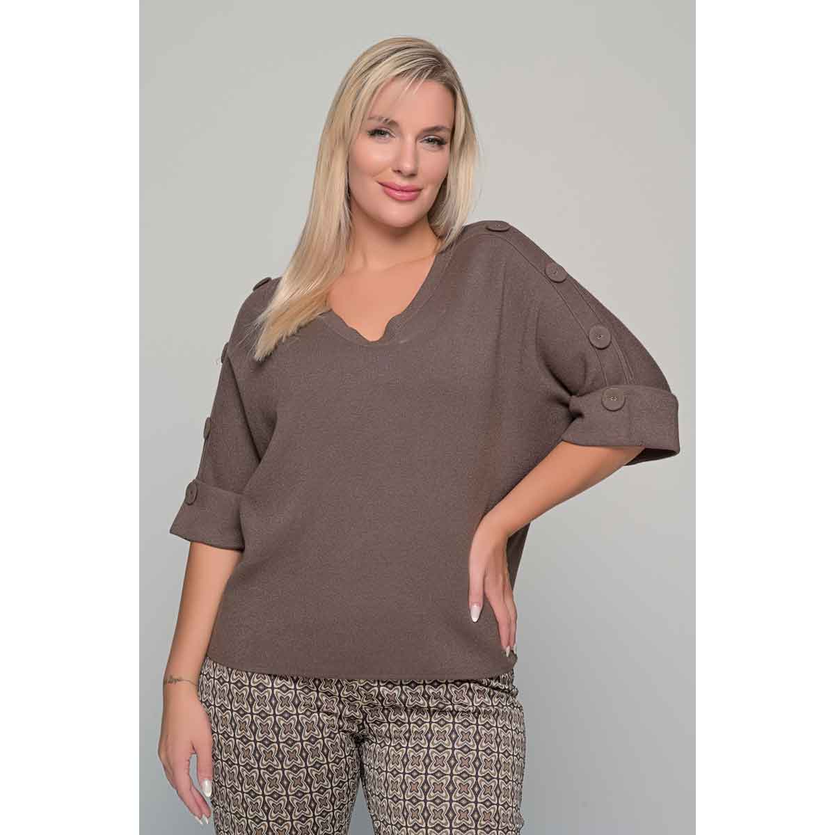 Gomore, καθημερινή, μπλούζα καφέ σοκολά, γυναικεία, με V ντεκολτέ, από λεπτό πλεκτό, μανίκια χωρίς μανικοκόλληση, τρουακάρ με ρεβέρ, σε άνετη γραμμή! Στο μήκος των ώμων έως το τελείωμα του μανικιού έχει σχέδιο με 4 ωτυμένα κουμπιά.