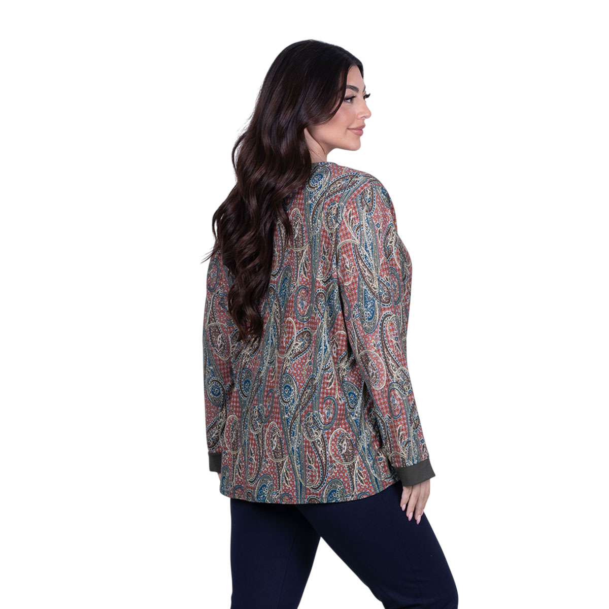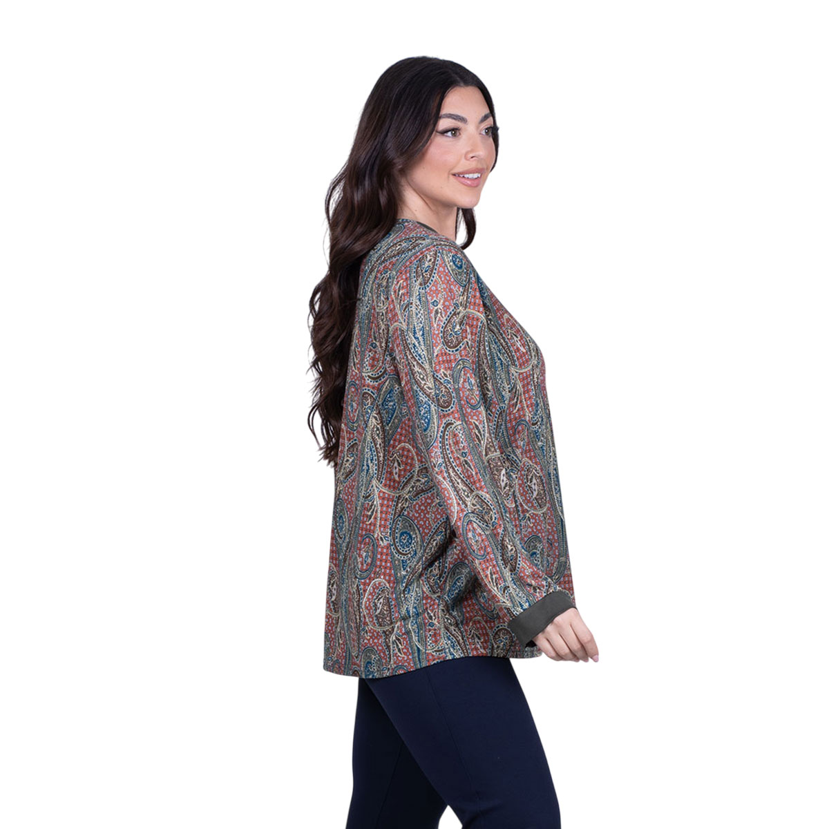 Gomore, καθημερινή, μπλούζα λαδί, με σχέδιο γήινους χρωματισμούς από λαχούρια, γυναικεία, μακριά, με μικρό V ντεκολτέ και γιακά με λαδί πέτο. Τα μανίκια της είναι μακριά με λαδί μανσέτες. Φοριέται κατά τη διάρκεια όλης της ημέρας!