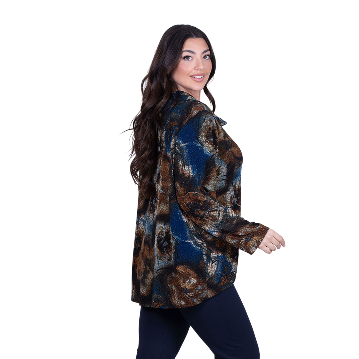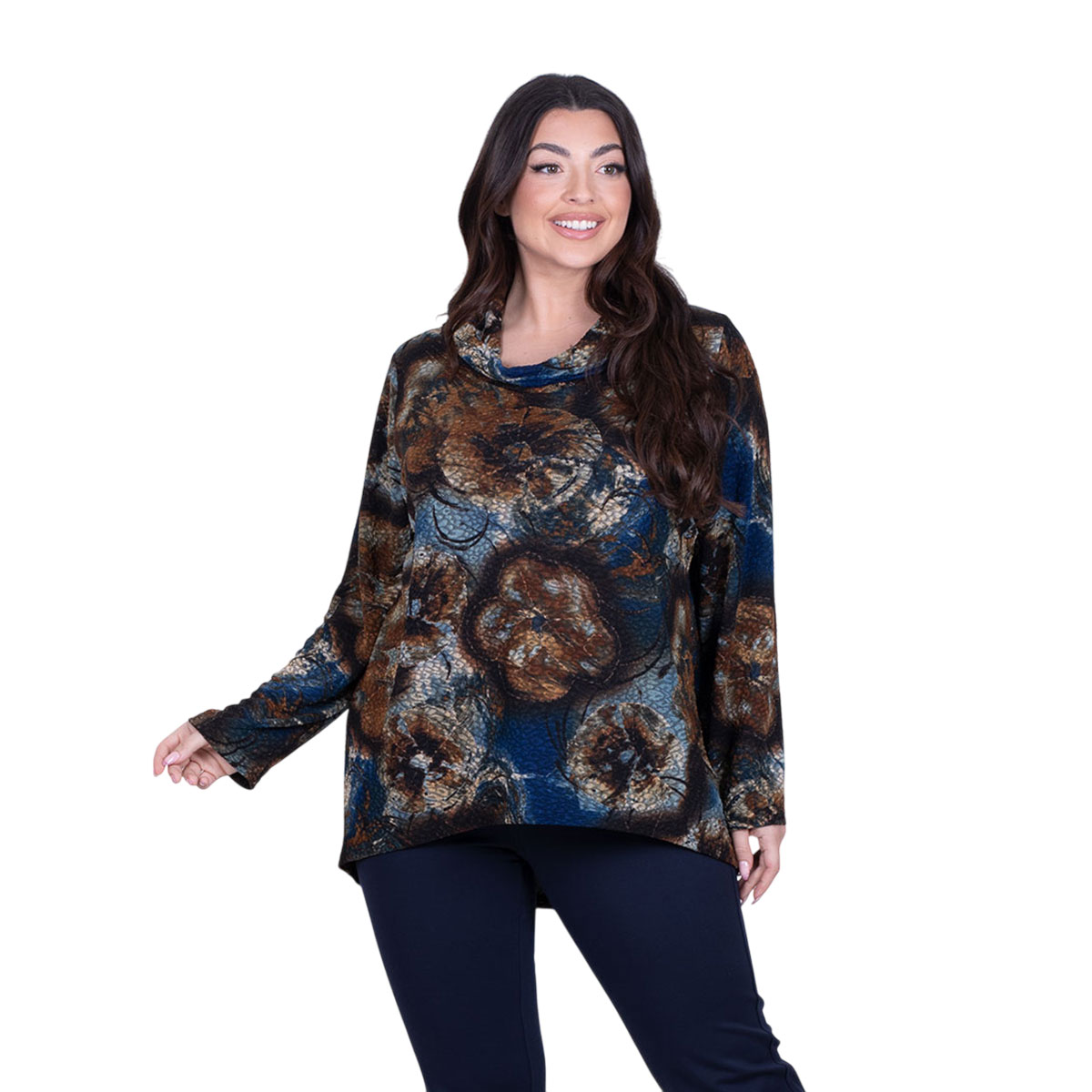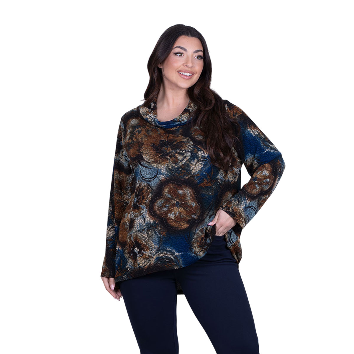 Gomore, καθημερινή, μπλούζα μπλε, γυναικεία, ανάγλυφη με μεγάλα γήινα floral σχέδια, μακρυμάνικη, με ξεχειλωτό γιακά και ασυμμετρία στα τελειώματα της. Φοριέται κατά τη διάρκεια όλης της ημέρας!