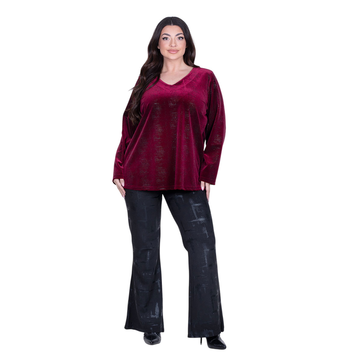 Το μοντέλο μας έχει ύψος 1.75, κιλά 80, περιφέρεια στήθους 1.12 cm, μέση 0.92 cm, περιφέρεια γοφών 1.10 cm & φοράει το 4 μέγεθος.