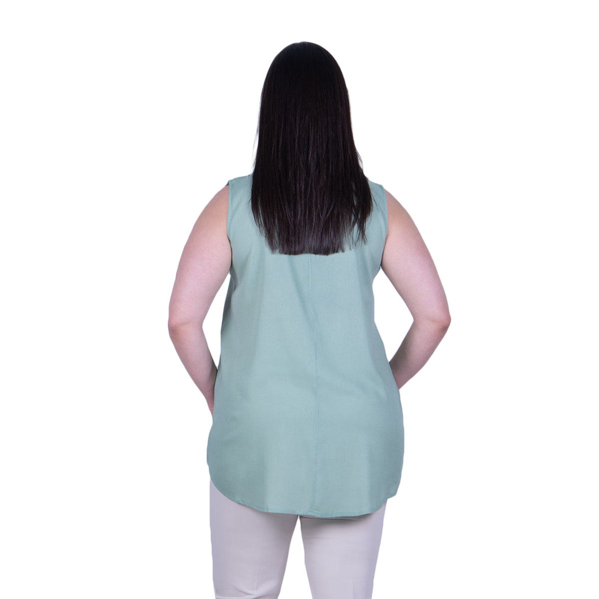 Platinum, άνετη, μπλούζα στο χρώμα της μέντας, γυναικεία, φαρδιά, μακριά, ασύμμετρη, αμάνικη και εβαζέ. Φοριέται όλη τη διάρκεια της ημέρας. Ιδιαίτερα δροσερό και φιλικό με το δέρμα σας.