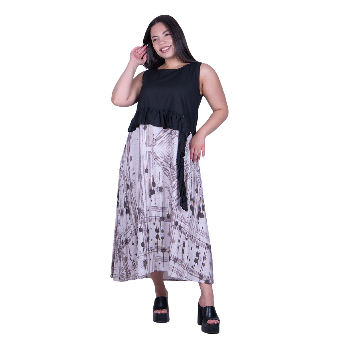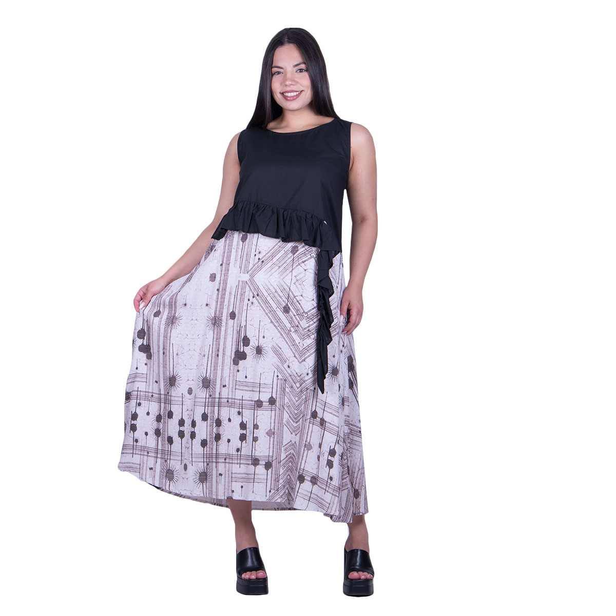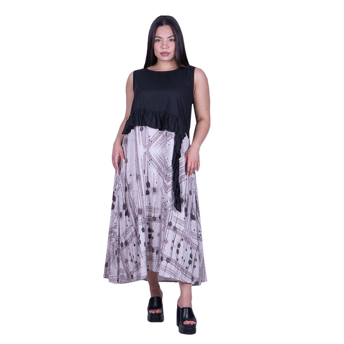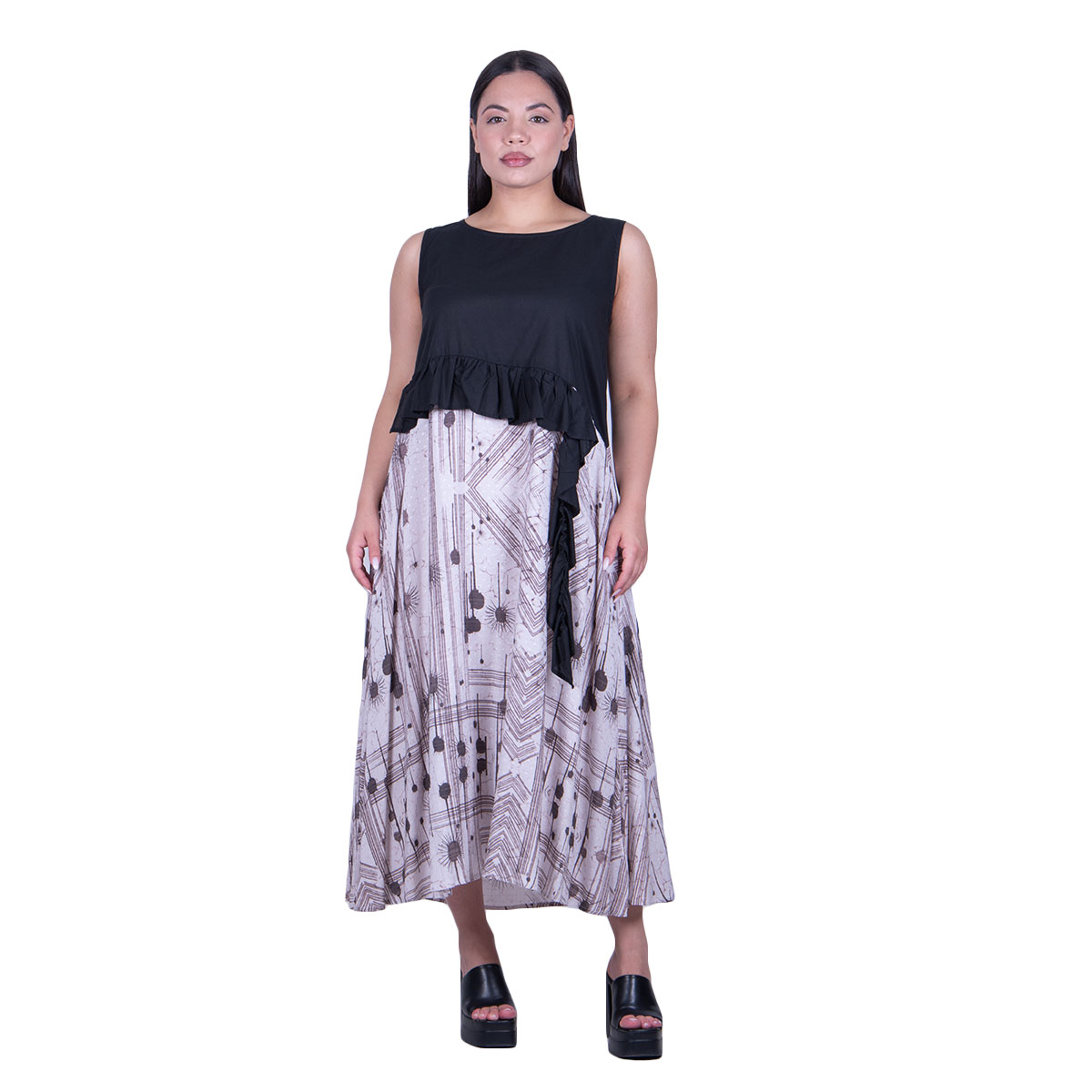 Platinum, καθημερινό, φόρεμα, ασπρόμαυρο, γυναικείο, καλοκαιρινό, αμάνικο, midi, με στρογγυλή λαιμόκοψη, σε γραμμή άλφα, κλος και σχέδιο με βολάν. Φοριέται όλη τη διάρκεια της ημέρας. Κολακεύει όλα γυναικεία σώματα!