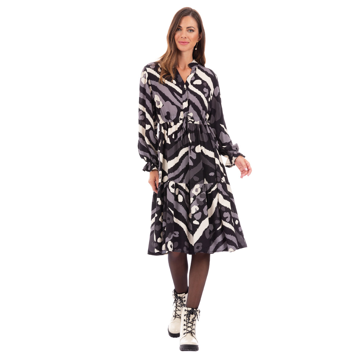 Platinum, καθημερινό, φόρεμα ασπρόμαυρο, με animal print σχέδια, γυναικείο, νεανικό, μακρυμάνικο, εβαζέ, σε άλφα γραμμή. Έχει μικρό V ντεκολτέ, γιακά στυλ Μάο, κουμπιά έως τη μέση και εσωτερικό ζωνάκι από το ίδιο ύφασμα για αυξομείωση της μέσης έως 1.04 cm. Τα μανίκια του στο τελείωμα τους έχουνε εσωτερικά γαζωμένο λάστιχο. Ρούχο με άνεση στο σώμα σας!