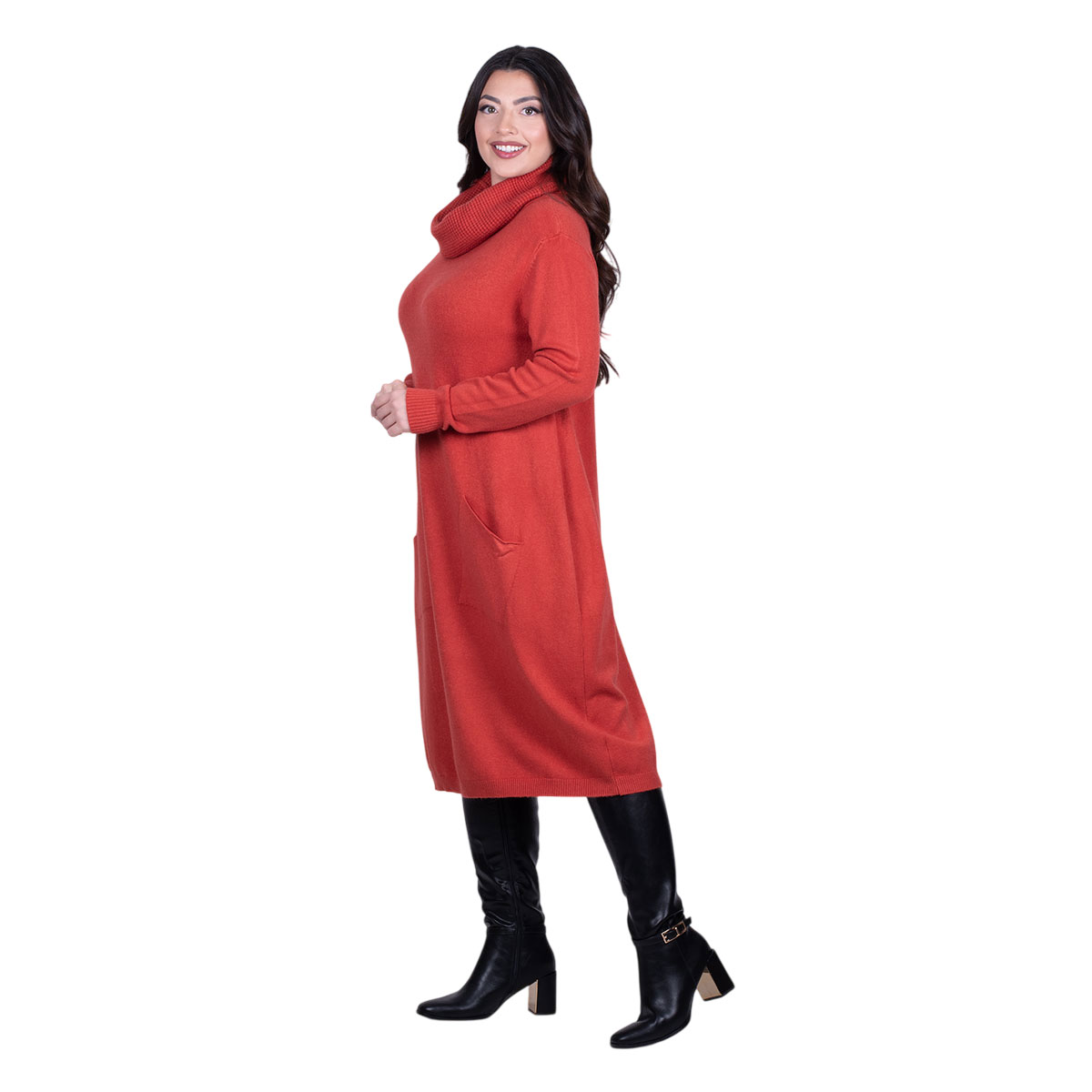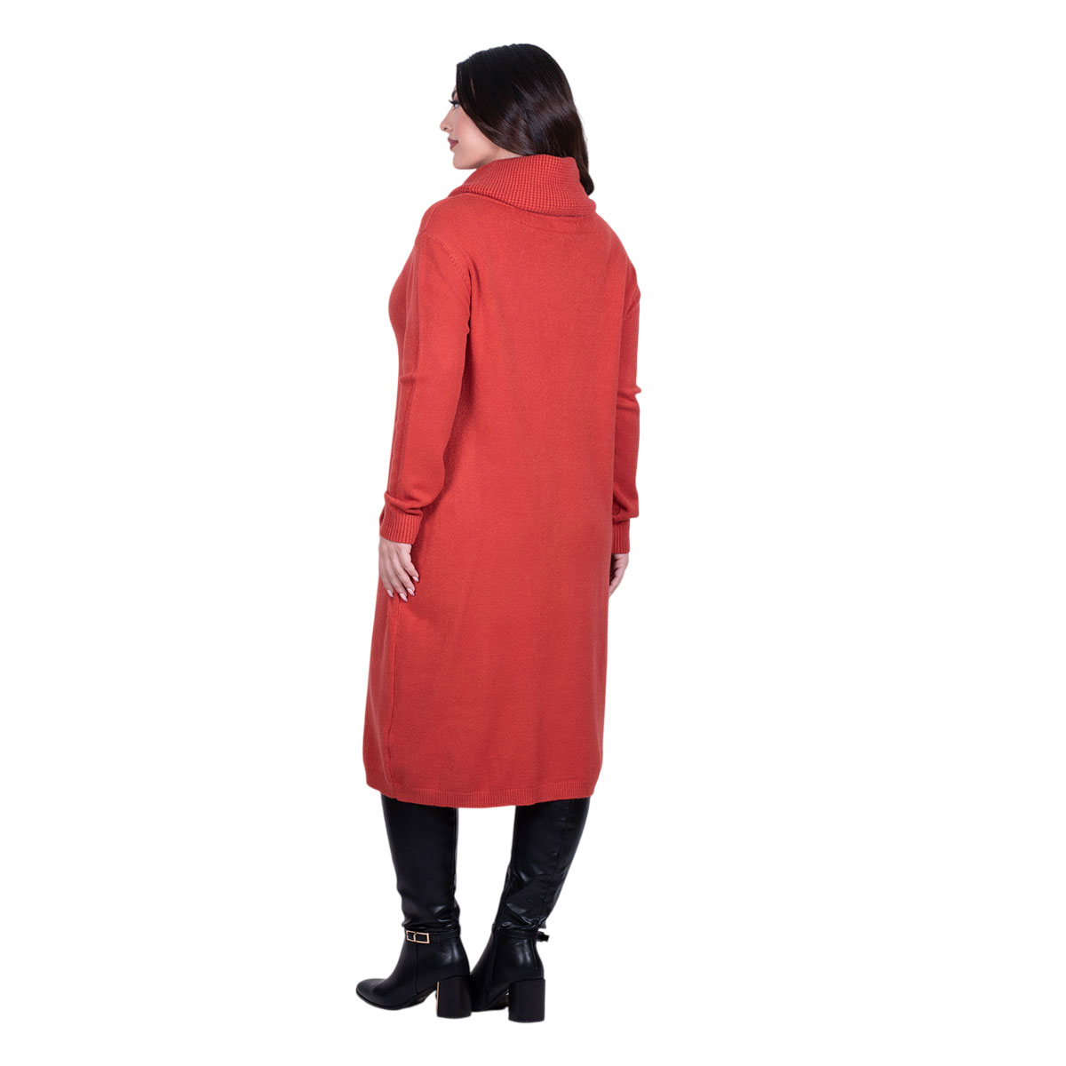 Platinum, νεανικό, φόρεμα εκάι, από λεπτό πλεκτό, γυναικείο, χειμωνιάτικο, midi, μακρυμάνικο και με δύο εξωτερικές λοξές τσέπες. Έχει ψηλό φαρδύ λαιμό με φαρδύ ξεχειλωτό γιακά και ριπ τελειώματα.